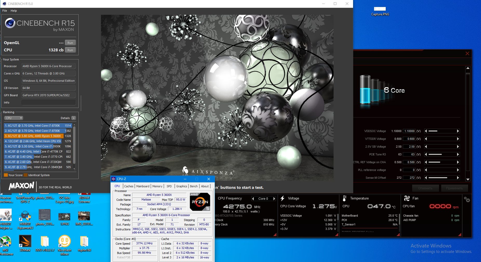 Итак, в продолжении тестов водоблока и проца 3600х, заметил, что при напруге 1,350 результат такой же как и с 1,3. А вот при снижении вольтажа до 1,275 -200 попугаев в СВ15, тестил им, как чисто процессорный бенч, ну и довольно быстро попугаи показывает.