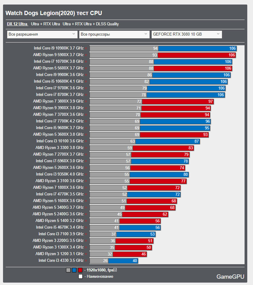Вот более реалистичная картина: 1080р, макс настройки. Как видим, средний фпс так или иначе упирается в гпу, и почти с любым процессором от 6 ядер разброс по среднему фпс в пределах 10-20%, то бишь выключи счётчик фпс и разницы никакой не увидишь. Хотя где там 5960х и зионы, позади всех райзенов чтоли