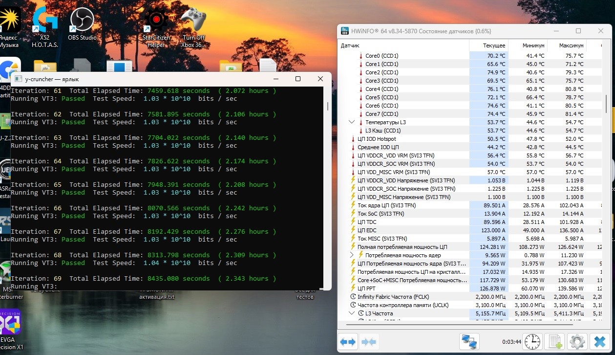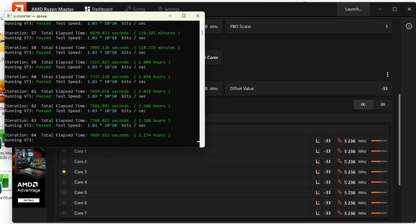 Ребят, ну вообщем оттестил я свой проц, правда чуть больше 2 часов в юкренче и по итого имею, -33 по всем ядрам, фабрика 2200, память 6200, тайминги выкладывал, SOC 1.225, температура при тесте 69-75 гр. потребление около 125-130 ватт, как ставлю -35 вылет минут через 20 на 15 ядре, это к какому оно относится? Сразу спустился до -33 на ядра, по одному ядру не стал заморачиваться, нудно все это. Посоветуйте еще в каких тестах прогнать? Считаю камень удачный, юкренч не выключаю, планирую до конца рабочего дня его крутить