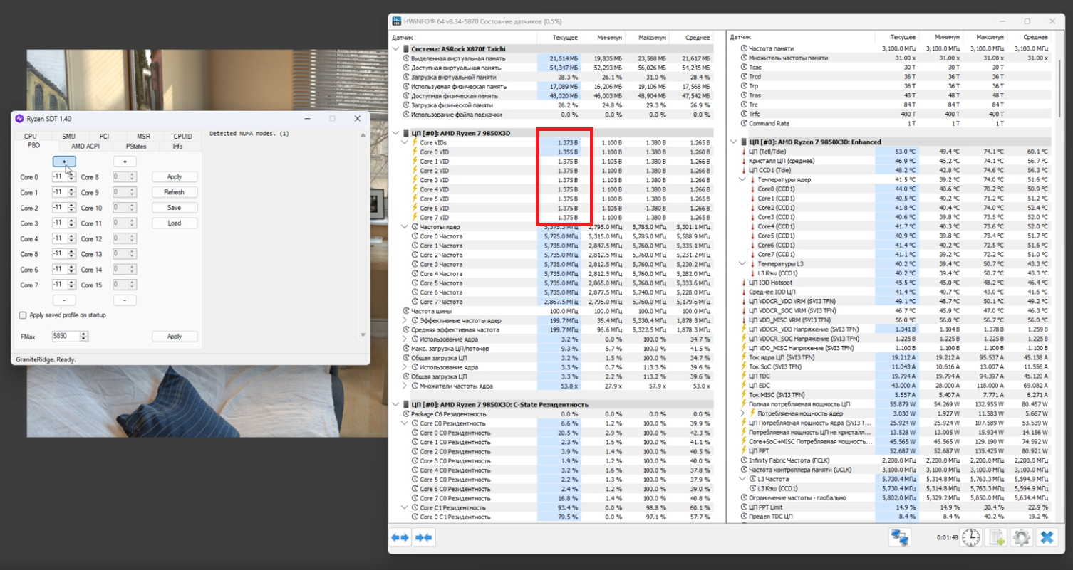 Снижать до менее 1.3в. Выше 1.3в уже под вопросом на постоянку. Хотя при твоих температурах и кастом воде, может и нормально. Но всё же 1.38 многовато имхо, учитывая нежность X3D процессоров.