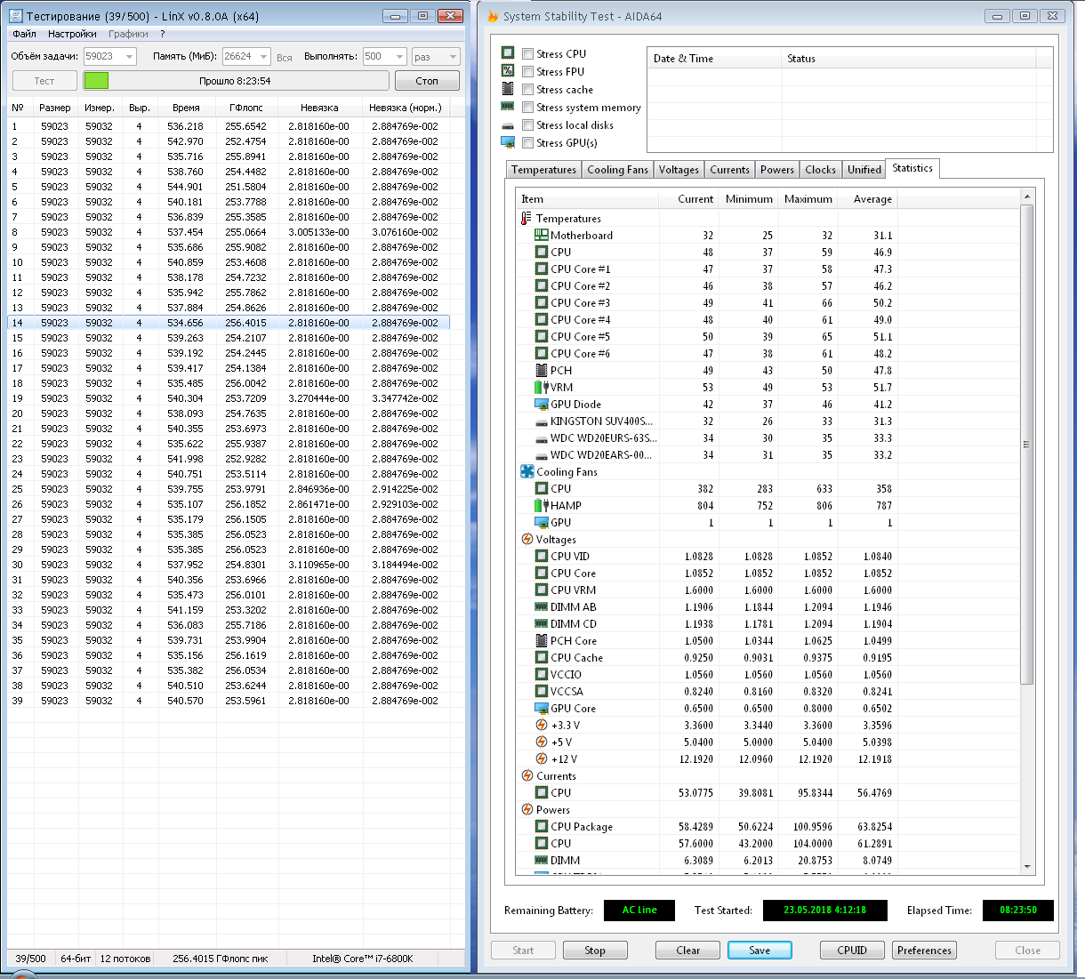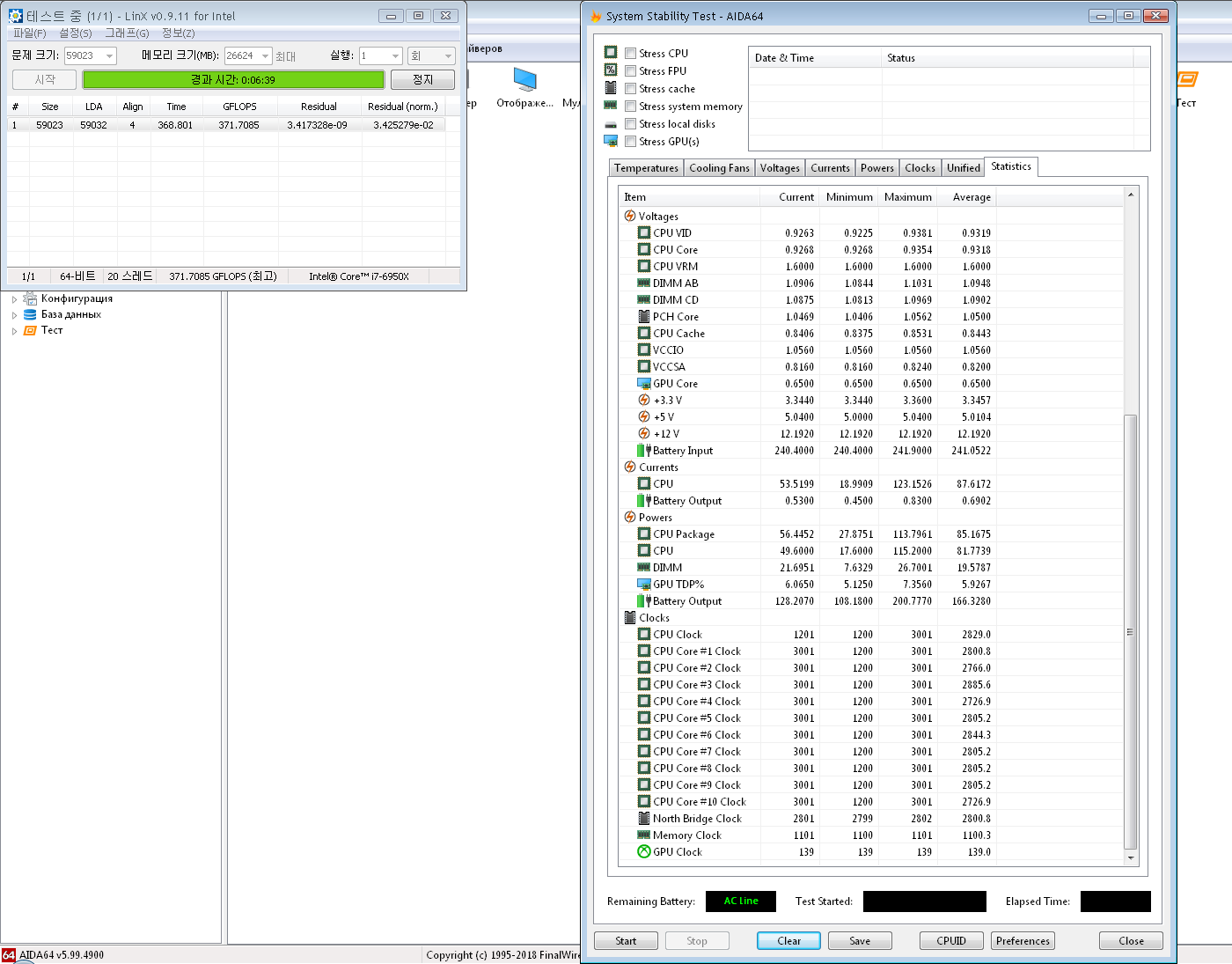 Если линпак проверяет на точность и получаются разные невязки - это признак нестабильности... если у LinX одинаковые невязки и при этом сильно расходятся гигафлопсы - это тоже признак нестабильности.
