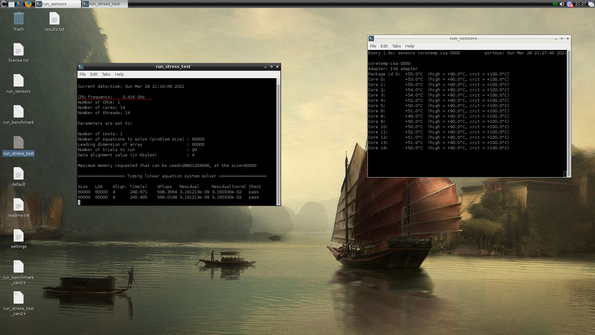 Как видим в Win10 результат в пике 596,7 GFLOPS, в Linux 599 GFLOPS. Разница 0,4 %. Ну оно и не удивительно, что в Win10 меньше, т.к. выполняется больше системных процессов с высоким приоритетом.