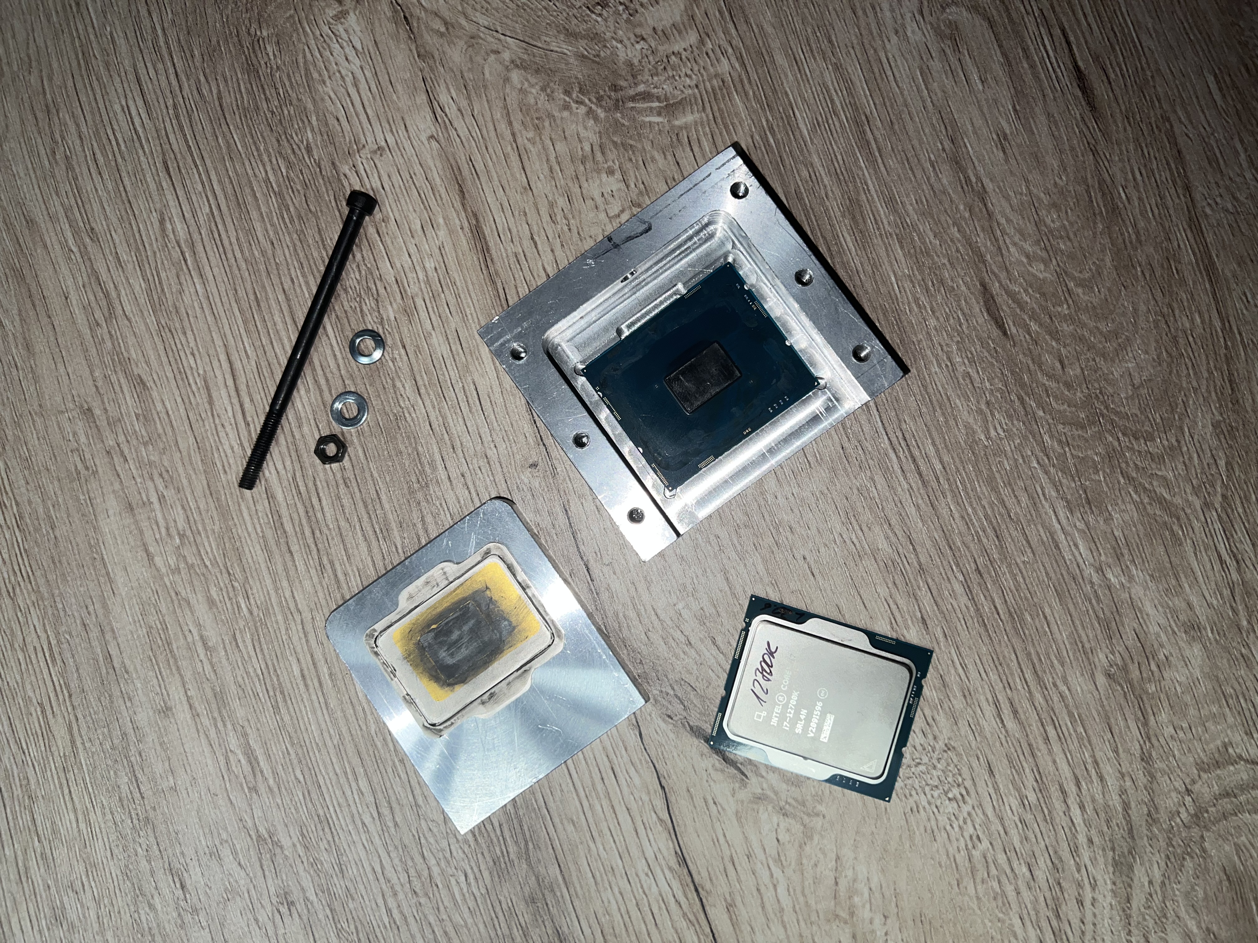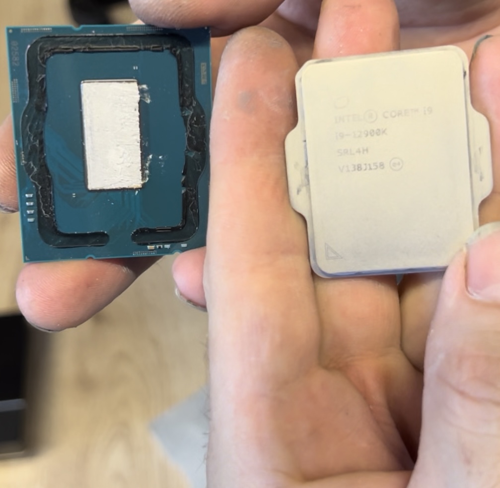 наконец-то снял крышку с 12900К больше всего времени ушло оттереть припой с процессор. в качестве растворителя припоя использовал CyberBlood часа два тер, ждал, тер , ждал процесс почти не двигался. Взял попробовать Coollaboratory Liquid PRO и о чудо буквально 5 мин. и старый припой с проца слез целым куском. ЖМ наносил только между кристаллом и крышкой температура в ОССТ стала 92 до этого уходила за 100 и начинался троттлинг. Для пробы устройство сделал из подручного куска алюминия, крышку напечатал на принтере. после проверки работоспособности скальпатора, сделал его полностью из алюминия