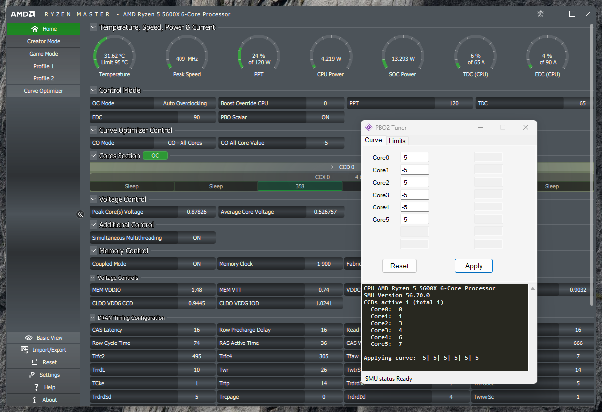 Лично я выставил сразу лимиты по максимуму что может VRM материнки и сколько может переварить охлаждение. Precision Boost Overdrive Scalar чем больше значение, тем позже и менее агрессивно процессор сбрасывает частоты после того как пропала нагрузка. Выставил на максимум. Что касается Load-Line Calibration то для всего кроме VCore выставляю в самое агрессивные значения, хотя и для VCore тоже. Precision Boost берёт во внимание показания именно мониторинга, а не запрашиваемое значение. Мониторинг материнской платы читается Precision Boost`ом через такой протокол как SVI2 TFN. Технология заключается в следующем: 1)выставляем Желаемый VCore Offset, если выставляем его в сторону увеличения, то малопоточная производительность будет выше, если в сторону уменьшения то многопоточная производительность будет выше. Под каждую настройку VCore Offset надо подправлять значения Curve Optimizer, 2)сначала для всех ядер уменьшаем Curve Optimizer, 3)запускаем скрипт, упомянутый выше, повторяем шаг номер 2, пока ни начнёт вываливаться ошибка на одном или нескольких ядрах и откатываемся на один шаг 4)запускаем после этого Cinebench R20, с большой вероятностью система просто перезагрузится, это по большей части лечится добавлением CPU PLL напряжения с 1,8V, но не превышая 1,9V, хотя от чрезмерного напряжения PLL может начаться обратный эффект и стабильность пропадёт, 5)далее начинаем настраивать Curve Optimizer для каждого ядра отдельно и проверяем стабильность как в шагах 3-4.