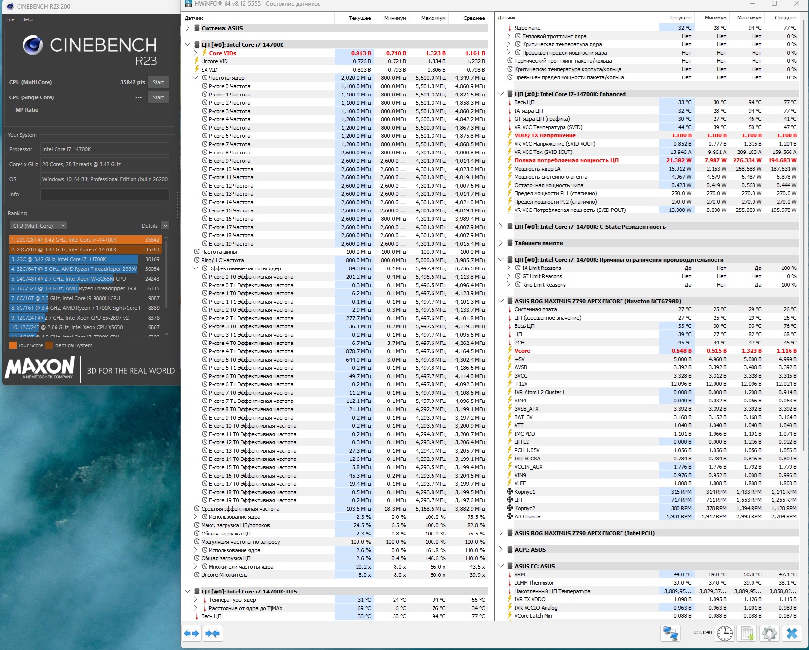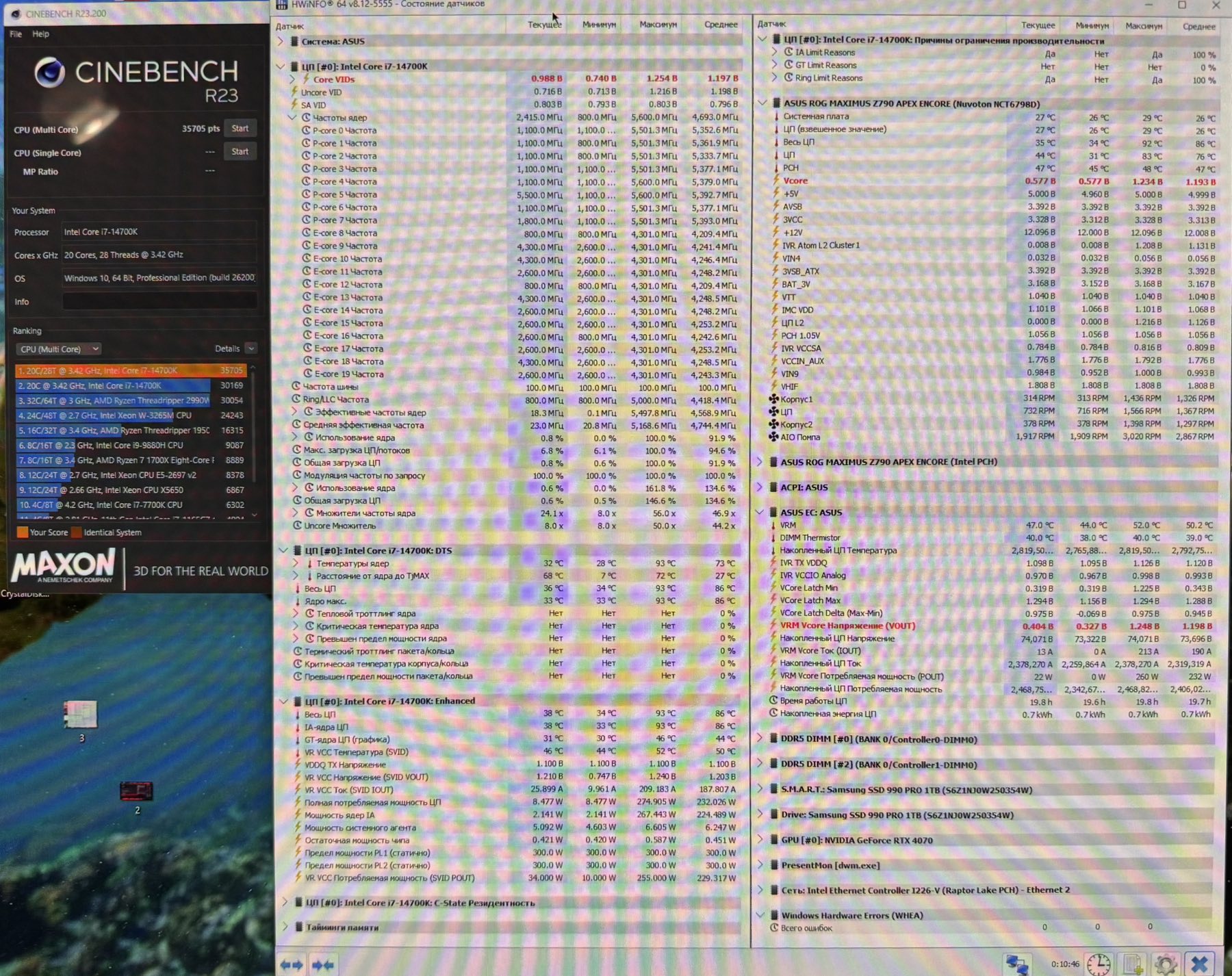 Скрины давайте лучше в момент нагрузки. Причём если выбрали синебенч, то делайте скрин именно в середине отрисовки картинки, чтоб не попасть в момент между, когда волна нагрузки отходит