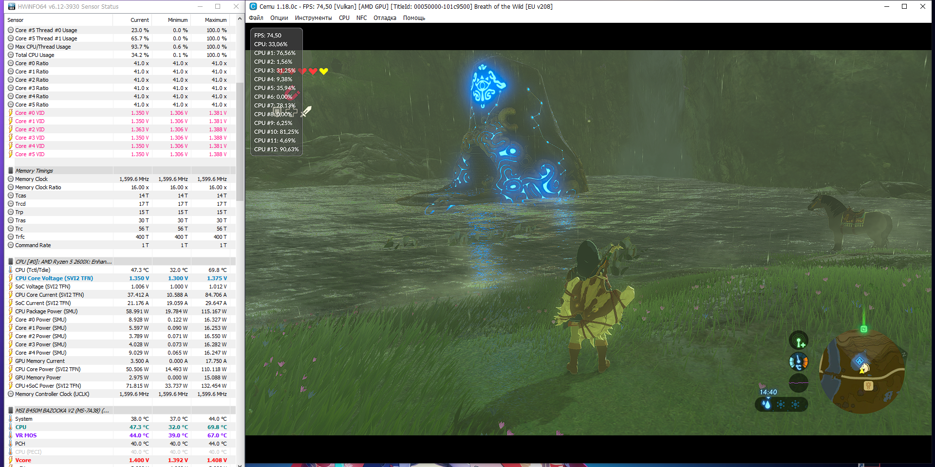 Вот например зельда, хорошо нагружает некоторые ядра, но их напряжение не падает ниже 1.35в, так же, как и SVI2 TFN. В Ватч Догс 2 тоже самое, но там уже 50% нагрузка на ЦП.