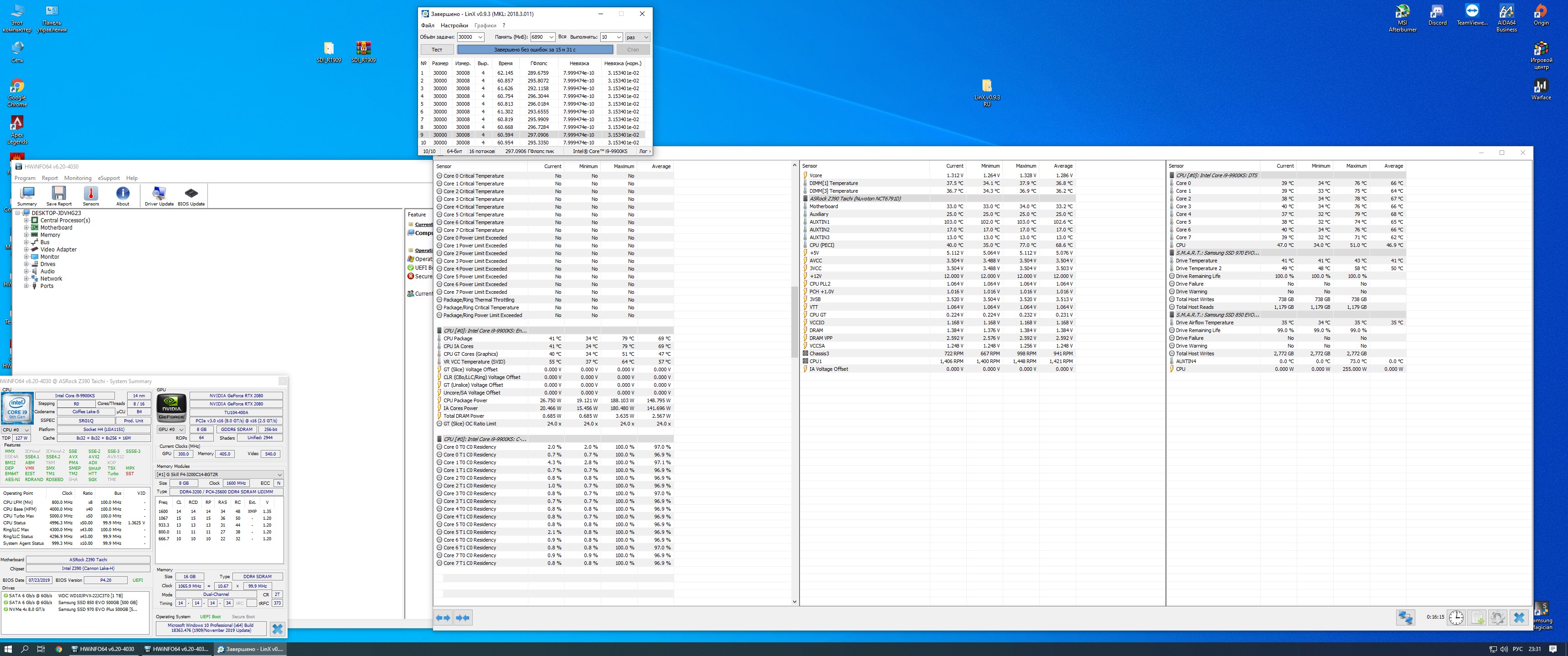 Полученный результат должен иметь следующий вид: Скриншот рабочего стола после прохождения >9 циклов (т.е. между 9 и 10 проходами). Вместе с LinX на рабочем столе должны быть развернуты CPU-Z (первая вкладка) и Core Temp, это обязательный минимум. Такой набор программ даст информацию о напряжении и температурах под нагрузкой-простоем. По желанию можете добавить другие программы, показывающие дополнительную информацию о вашей системе, например третью вкладку CPU-Z, которая покажет модель материнской платы и версию BIOS. Пример результата разгона: Mad Max, 5100 МГц (AVX 0), i7-8086K, HT-ON, Cache 4700, Vcore=1.36V, Batch L805E123, Gigabyte Z370 Aorus Gaming 7 (bios F6), Be Quiet! Dark Rock Pro 4, ЖМ под HS, Windows 10 Pro 64-bit 1809, LinX 0.9.3 64bit.
