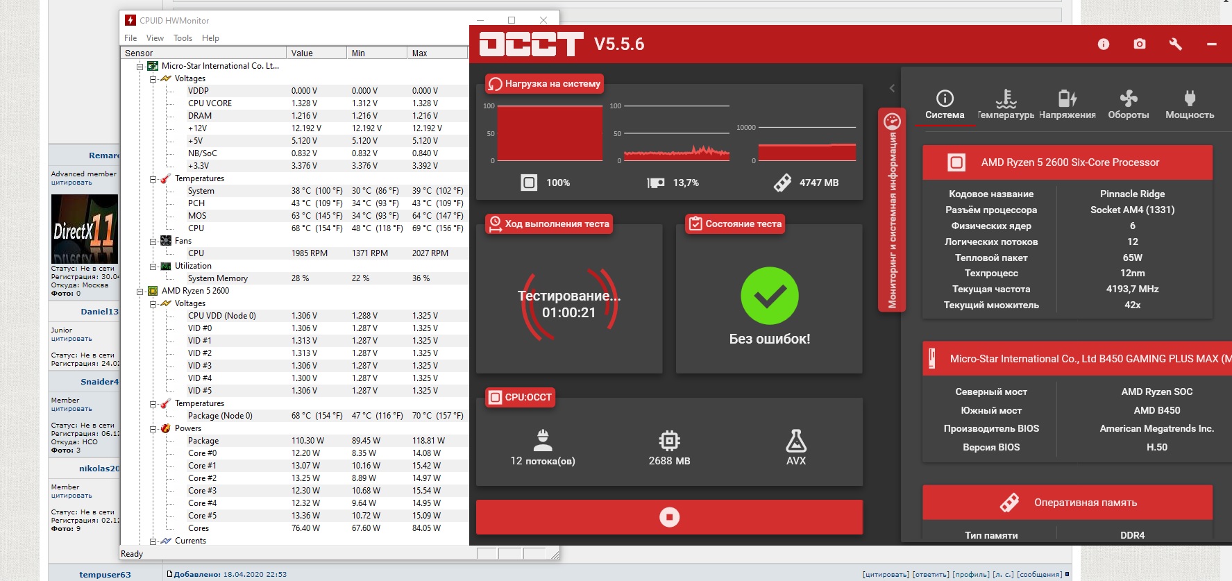 в общем - каждая сотня мегагерц даётся ценой огромного повышения вольтажа, шума и нагрева - на жирной материнке х470 была бы возможность более тонкой настройки, на бомжатине сильно большие ступени между vcore - охлада не хватает и это на стоковом vsoc! а при разгоне памяти его придётся подтянуть к 1.1-1.15v, что вызовет ещё 15-20вт нагрева и улёт температур за 80с, но ставить что то вроде архона за 3.5тр смысла нет, так как проще слить 2600 и взять 3600, пусть и с доплатой в 5тр, зато в стоке он резвее чем разкочегаренный zen+ да и нужно вкладываться в технологичность: лучше мелкий электродвигатель, чем паровой котёл побольше)