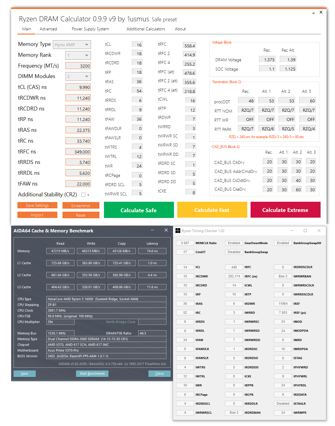 Ну всё я наверное сдаюсь. Мать X370 Prime унылое Г. Память CORSAIR Vengeance LPX CMK16GX4M2B3200C16 DDR4 - 2x 8Гб на чипах Hynix просто наотрез отказывается стабильно работать на 3200. Запускается на 3200 с ProcODT 60, RZQ7/Off/RZQ4, Cad bus 20/20/20 VDRAM 1.39/ SOC Voltage 1.1(1.125) при тайминга из калькулятора, но сыпет ошибками. Куча безуспешным попыток. Добился на 3066 результатов близких к тому, что на авто даёт для 3200 мать при низких таймингах: