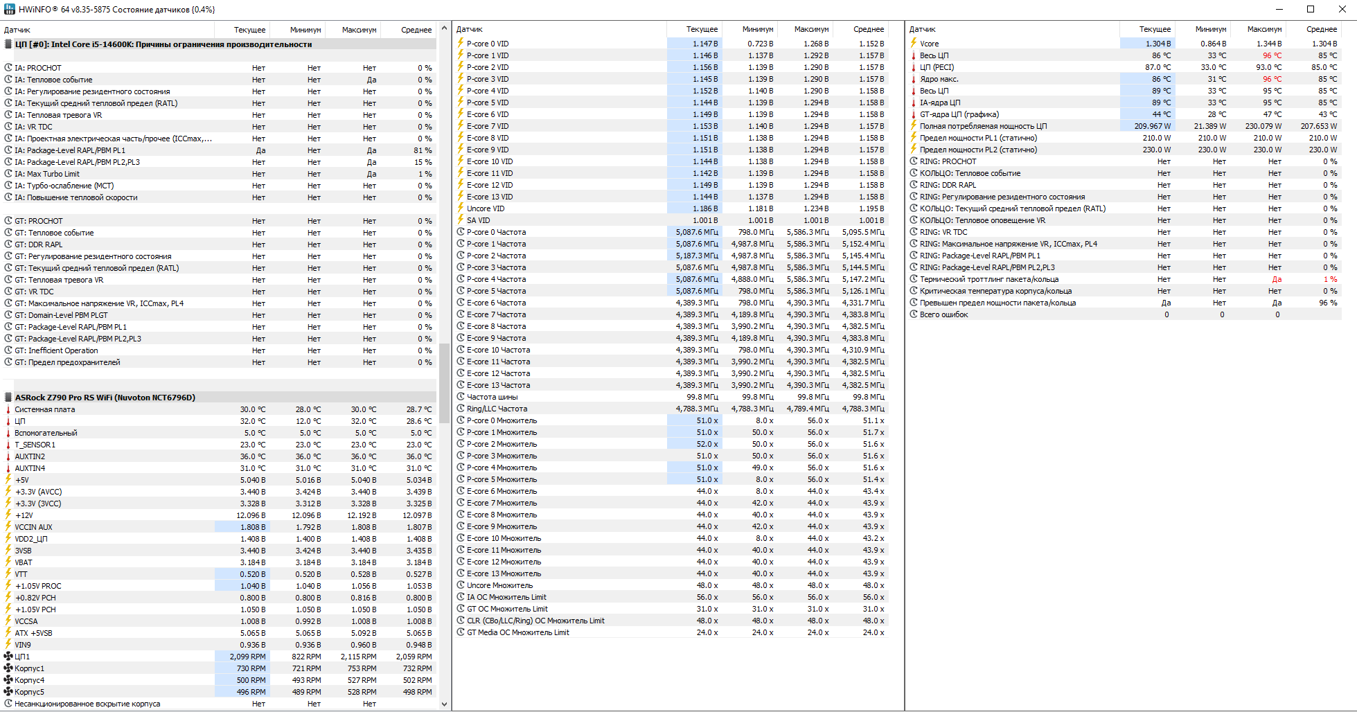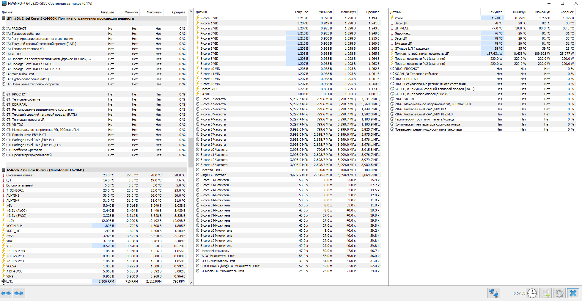14600K, ASRock Z790 RS pro wifi, 64GB RAM ax5u6400c3232G-DCLABK XMP 6400 cl 32 power delivery profile performance (без этого он 160 что ли Вт дает и даже сток не держит). P-core: x56; AVX2: x55; E-core: x44, Cache/Ring: Auto (max x52, реально x50), PL1 215, PL2 230 (32сек), LLC Level 3, blck 100.3