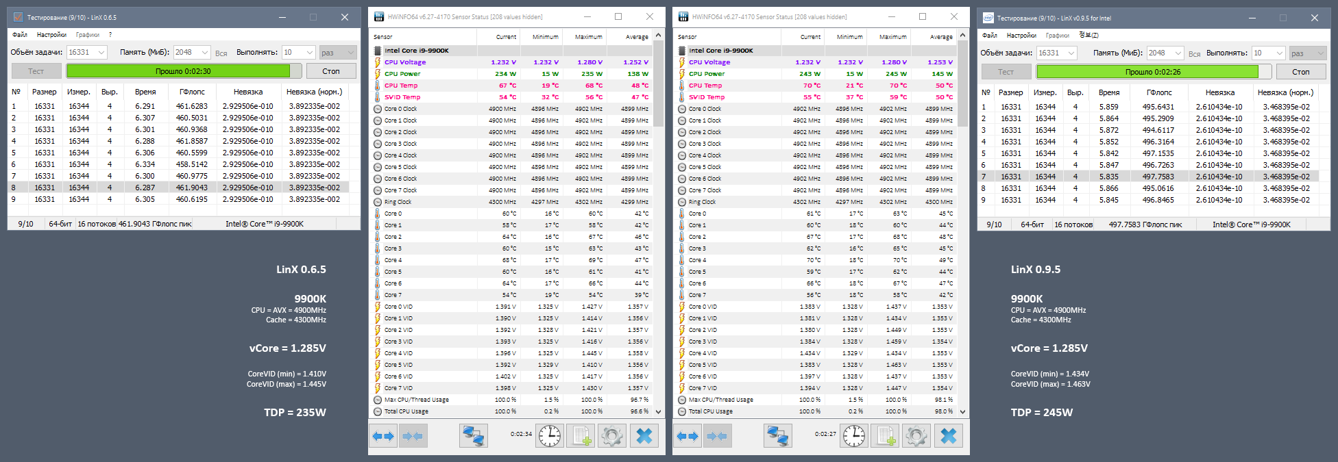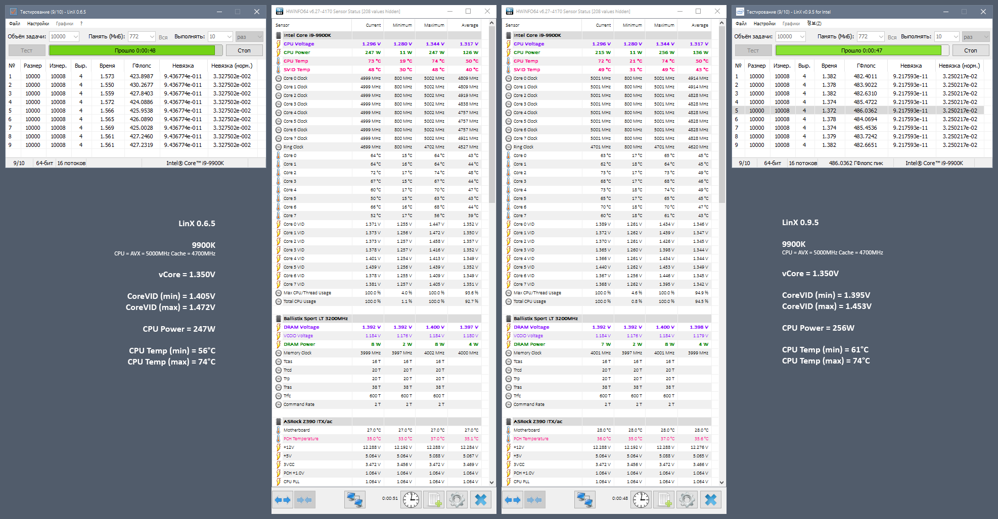 10900к у меня работает 5.2/5.0avx на 1.36v, линкс держит на 88С - после 9900к это меньше на 8-10 градусов, но ядер на 2 больше. Контур остался прежним, возможно пару-тройку градусов дал новый ватер от ЕК в сравнении с прежним топом ЭВО, но в любом случае температура камня ниже стала. И напряжение ниже. Покручу память до 4800 в разгоне, увидим есть ли разница с 9900к по imc.