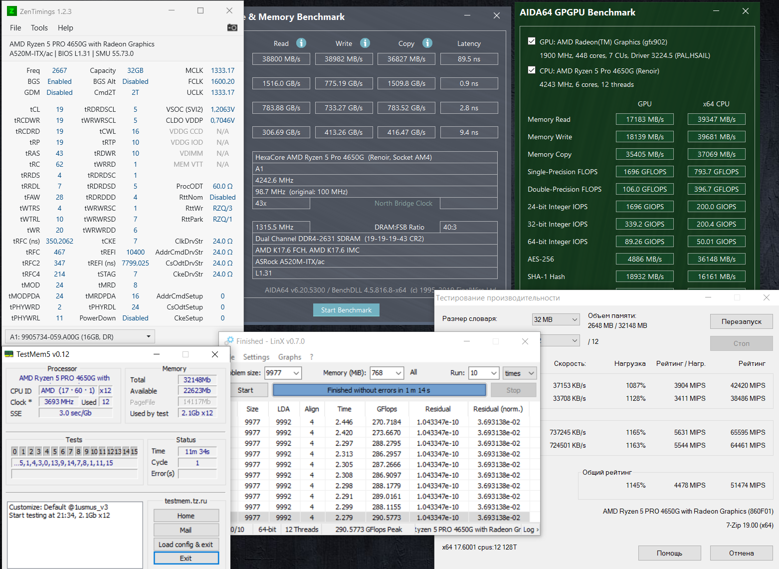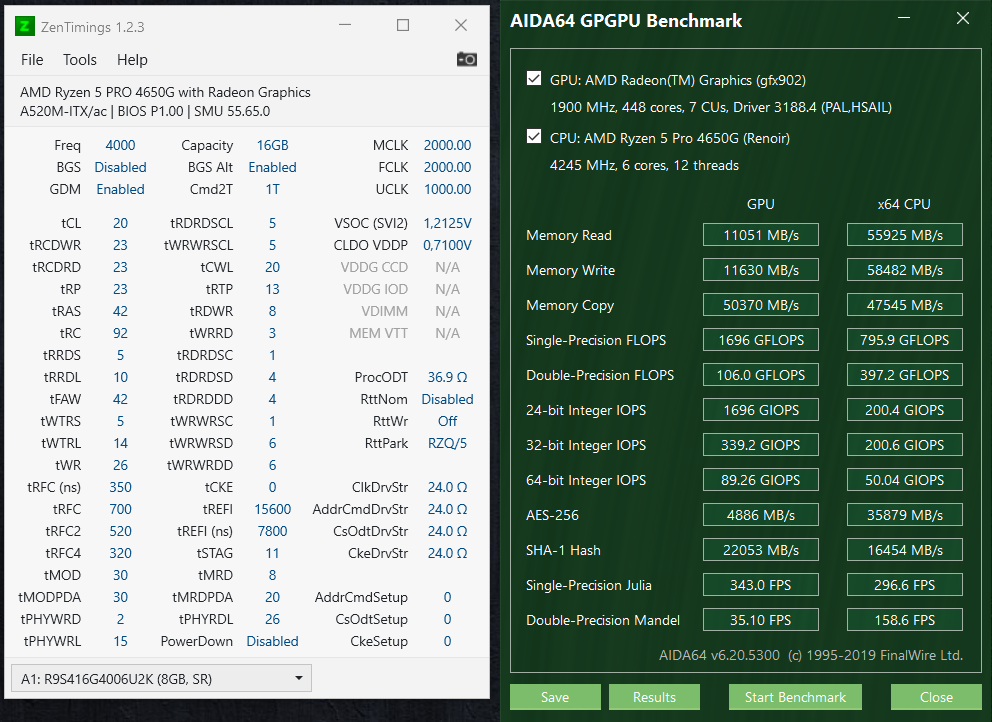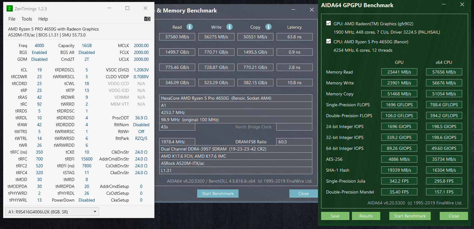 Привет. Сравнивая зеленый бенчмарк с теми, которые есть в теме, думаю, что то не так с настройками. Сейчас просто стоит xmp профиль, память AMD Radeon R9 Gamer Series R9S416G4006U2K. Мать ASRock A520M-ITX/ac. FCLK в биос руками выставлена на 2000. UCLK пункта нет, почему то выставляется в 1000. Сам без подсказок не осилю настроить. upd: Обратил внимание на версию биоса, полез на сайт асрока - точно, есть сильно новее с обновлениями агеса и прочая. Обновил. После старта 10ки, на экране серозеленая каша, на ощупь обновил драйвер радеона - всё стало норм. Снова выставил XMP и FCLK=2000, выключил gear down mode, чтобы CL19 стало. А вот установку частоты веги так и не нашел в биосе, хотя после обновления добавились всякие параметры. Теперь по скринам бенчей аиды видно, что стало резвее. А latency вообще упал с 86нс до ~64нс.