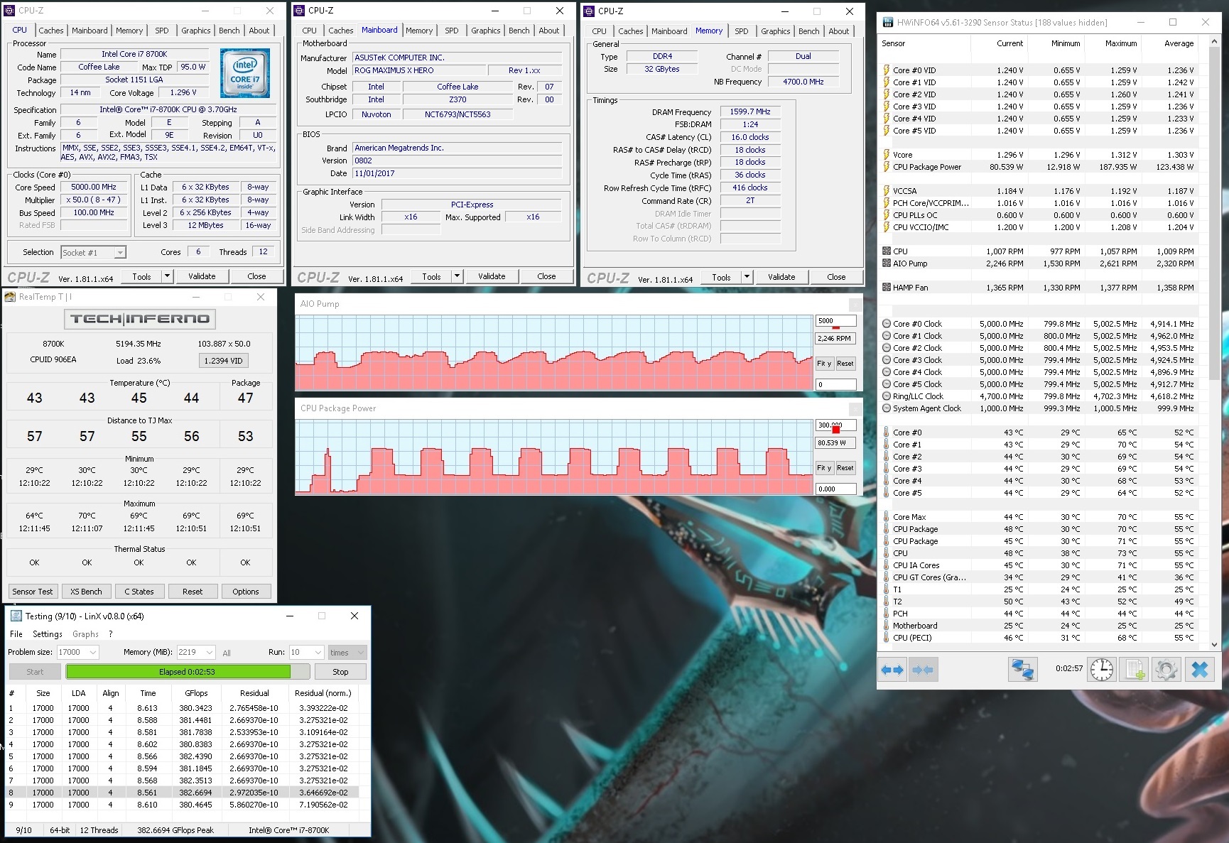 Полученный результат должен иметь следующий вид: Скриншот рабочего стола после прохождения >9 циклов (т.е. между 9 и 10 проходами). Вместе с LinX на рабочем столе должны быть развернуты CPU-Z (первая вкладка) и Core Temp, это обязательный минимум. Такой набор программ даст информацию о напряжении и температурах под нагрузкой-простоем. По желанию можете добавить другие программы, показывающие дополнительную информацию о вашей системе, например третью вкладку CPU-Z, которая покажет модель материнской платы и версию BIOS. Пример результата разгона: Mad Max, 5100 МГц (AVX 0), i7-8086K, HT-ON, Cache 4700, Vcore=1.36V, Batch L805E123, Gigabyte Z370 Aorus Gaming 7 (bios F6), Be Quiet! Dark Rock Pro 4, ЖМ под HS, Windows 10 Pro 64-bit 1809, LinX 0.9.3 64bit.