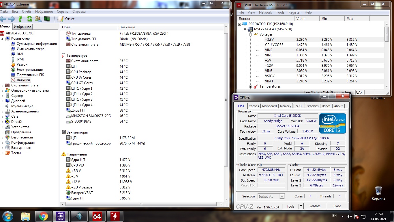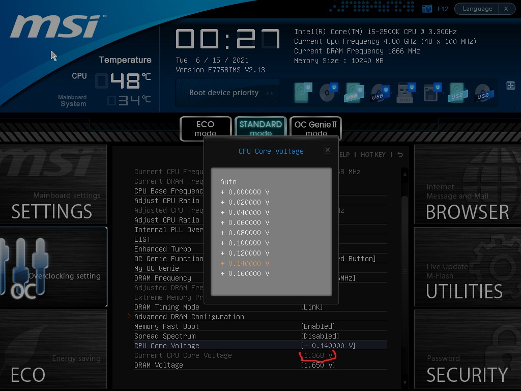 Доброго времени суток. Прошу Помощи с разгоном данного камня на моей MSI Z77A G43...Получилось взять 4800мгц, на напруге +0,160000v. потом понизил до +0,140000v .Температуры 55-65 градусов в игрульках...В простое 45-47. Работает. На протяжении дня Bsod не ловил пока. Но пугает Вольтаж который показывает CPU-Z При Холодном Старте это Аж 1.480v, Переодически прыгает до 1.454v. В нагрузке напруга снижается. Однако В Биосе совершенно другие цифры, 1.368v-1.378v. Чему верить? немного прикинув вспомнил про LLC,но к сожалению. на моей матери Нету данной настройки, и даже Offset отсутствует, выпилили со временем с обновлениями биоса. Обновив биос до последней версии LLC и Offset так и не нашел. Увы. Вопрос. Можно Ли оставить всё так как есть? P.s пробовал снижать вольтаж на 1 шаг сразу BSOD.