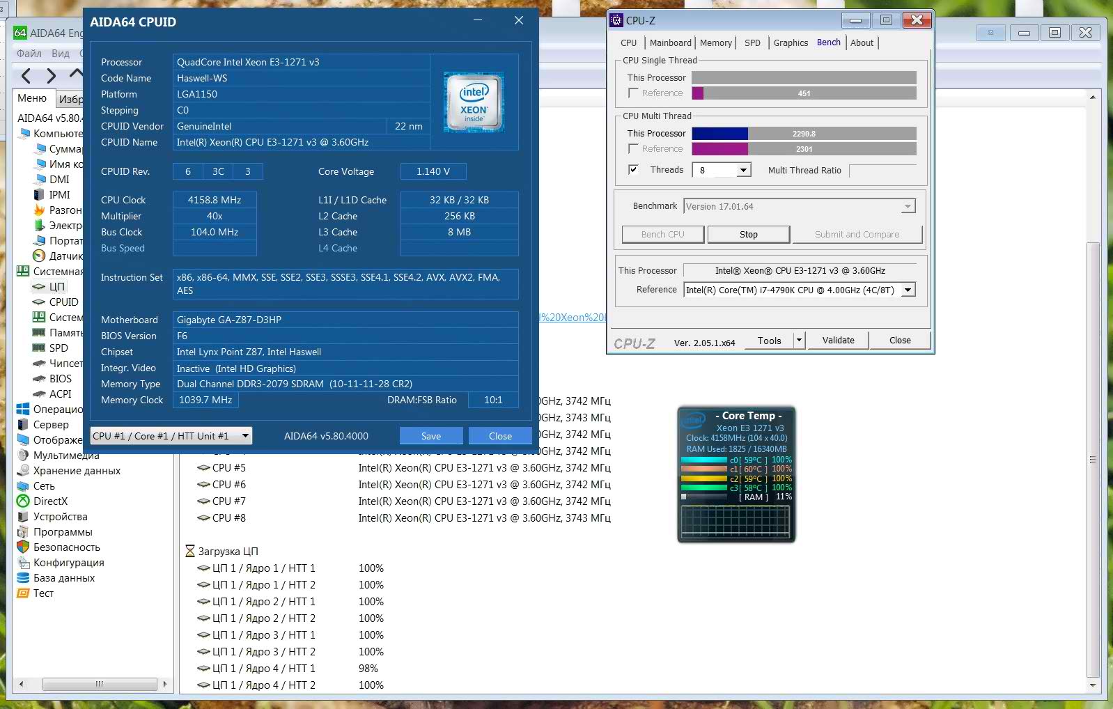 Xeon E3 1271 v3 после небольшой модификации BIOS стабильно работает на 104 Мгц Base Clock и на 4159 Мгц при загрузке всех ядер и потоков. Температура не поднимается выше 60 градусов после часа стресстеста из CPU-Z либо Аидовского теста. В простое частота падает до 832 Мгц.