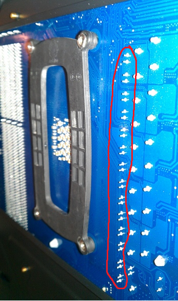 Мелкие выводы слева видите? Это кондеры: 1пара выводов=1конденсатор. Щупы прикладываете к каждому выводу и смотрите на напряжение. Главное не замкните их, хотя и в таком случае по идее должен БП включить защиту от КЗ. Будет два напряжения: ядра цпу и напруга на cpunb\l3 кэш. За вашу плату конкретно не скажу где будет какое, но их методом узнавания вполне легко вычислить, смотрите что у вас там в биосе стоит и сравниваете. Если я неправ, пускай меня поправят.
