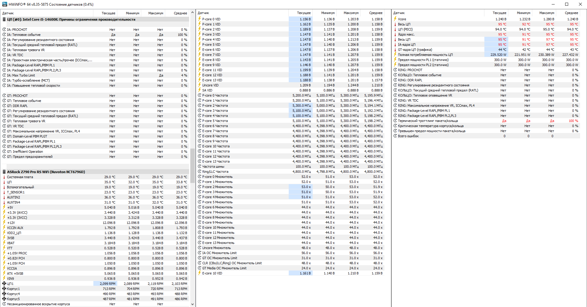Вот тротлинг на 230 Вт 95град на 5200 МГц. Понижаем пожираемую мощность каким-то образом, для 5.2ГГц теперь требуется 210 Вт.