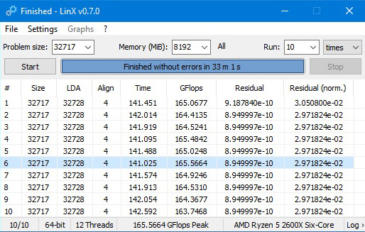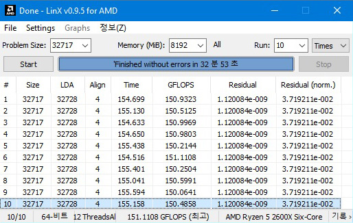 Я последний раз LinX 0.7.0 юзал года полтора назад когда проверял стабильность системы еще на Windows 10 1703 или 1709 уже непомню,все было хорошо,вчера наткнулся на тему где говорилось что LinX 0.7.0 глючный и стабильность системы на AMD нужно проверять другой версией.Вот решил качнуть и заюзать еще раз уже на Windows 10 1909,и невязки идут что в стоке, что в разгоне(оперативная память). А вот в LinX v0.9.5 (AMD) даже при повышенном значение, problem size 32717,Memory 8192,run10 в(LinX 0.7.0 стояло все гораздо ниже) все проходит без проблем.