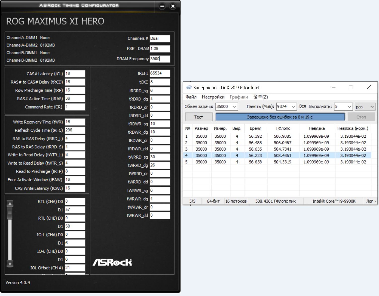 Да я прикалываюсь, на моем скрине и так 500 Гфлопс. Предел для 9900K - 550-570 Гфлопс. На днях докручу память и посмотрю, что выйдет (в пятницу сменил свой 8086K 5,3 Ghz на 9900KF). Смысл скринов был в том, что бы показать отличие производительности системы на вторичных-третичных автотаймингах подаваемых материнкой и системой с чуть докрученными вторичками.
