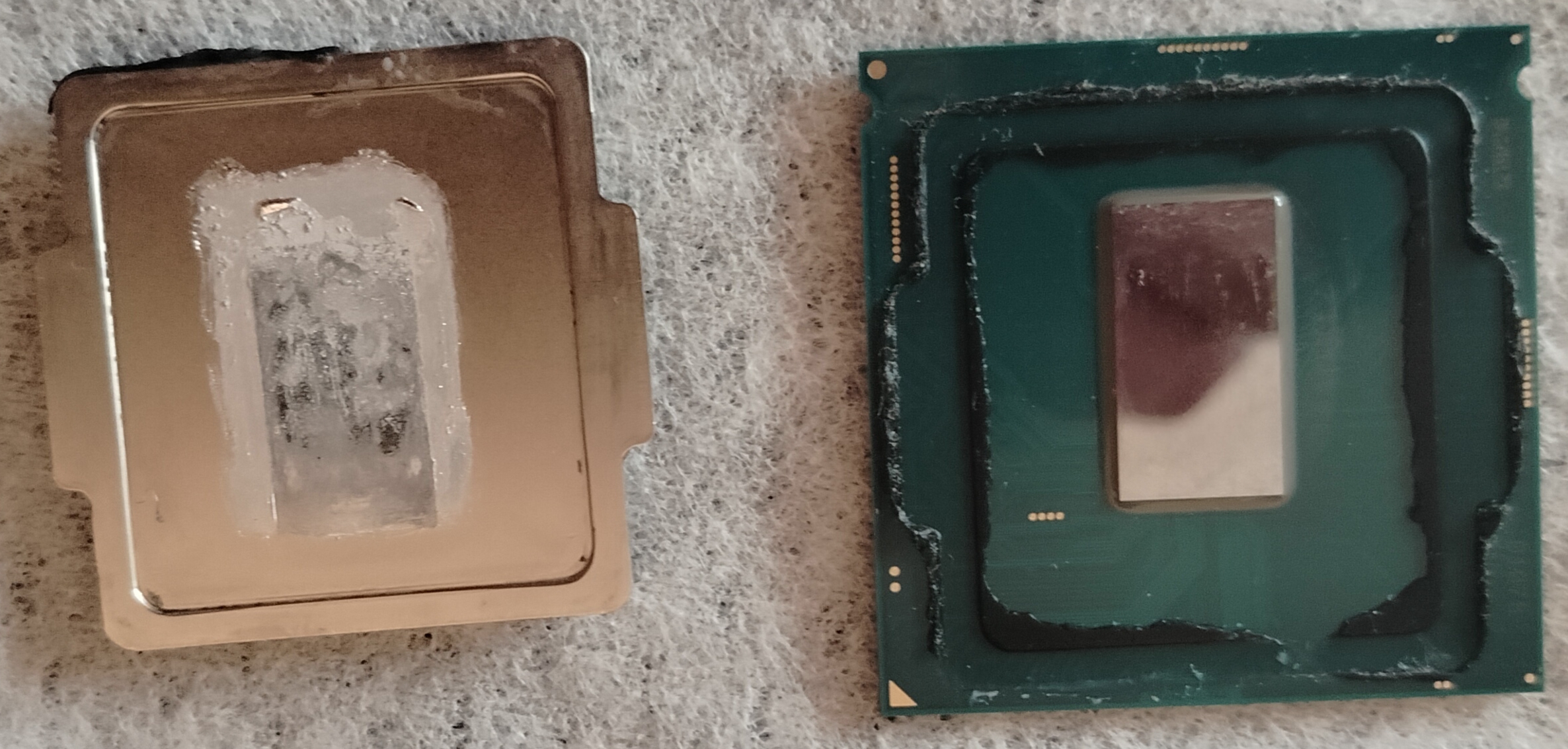 TLT163 l7-8700k. Покупался в 2018ом, тогда же и скальпировался. Ничего не пдгонял, ничего не шлифовал. По лето 2024 года больше даже не вынимался из сокета. В середине прошлого года начала активно рости температура, в аиде 64 под сотку и тротлинг. Вскрыл процессор, высох ЖМ. Отдирать ничего не пришлось, грубо говоря крышка отклеилась буквально от легкого усилия. От ЖМ остался тонкий металлический налёт. С камня оттерся буквально за две секунды. А вот на крышке пришлось потереть. Полностью не удалился, на ощупь чувствовался рельеф. Забил, нанёс новый ЖМ и зажал в сокет. По ощущениям температуры стали даже ниже чем после первого скальпа 6 лет назад. ЖМ Гризли. Тот же самый, что и при первом скальпе. Всё это время лежал в коробочке в шприце. Вообще скальп это имба невероятная, даже для тех, кто не гонит. По крайней мере тех, что на термопасте. Сейчас на новой сборке первое время уснуть не мог, шумит падла, хотя вентили еле крутятся. Начинаю изучать опыт скальпа проца, который ниже в профиле. Фото зразу после повторного вскрытия.