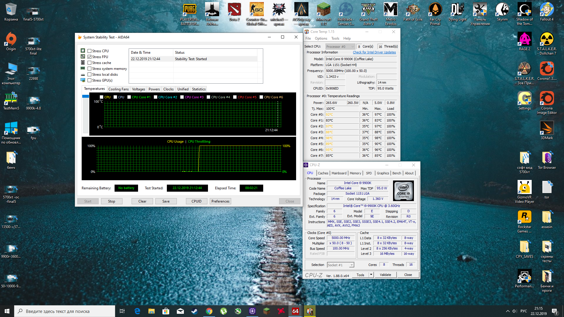 Полученный результат должен иметь следующий вид: Скриншот рабочего стола после прохождения >9 циклов (т.е. между 9 и 10 проходами). Вместе с LinX на рабочем столе должны быть развернуты CPU-Z (первая вкладка) и Core Temp, это обязательный минимум. Такой набор программ даст информацию о напряжении и температурах под нагрузкой-простоем. По желанию можете добавить другие программы, показывающие дополнительную информацию о вашей системе, например третью вкладку CPU-Z, которая покажет модель материнской платы и версию BIOS. Пример результата разгона: Mad Max, 5100 МГц (AVX 0), i7-8086K, HT-ON, Cache 4700, Vcore=1.36V, Batch L805E123, Gigabyte Z370 Aorus Gaming 7 (bios F6), Be Quiet! Dark Rock Pro 4, ЖМ под HS, Windows 10 Pro 64-bit 1809, LinX 0.9.3 64bit.