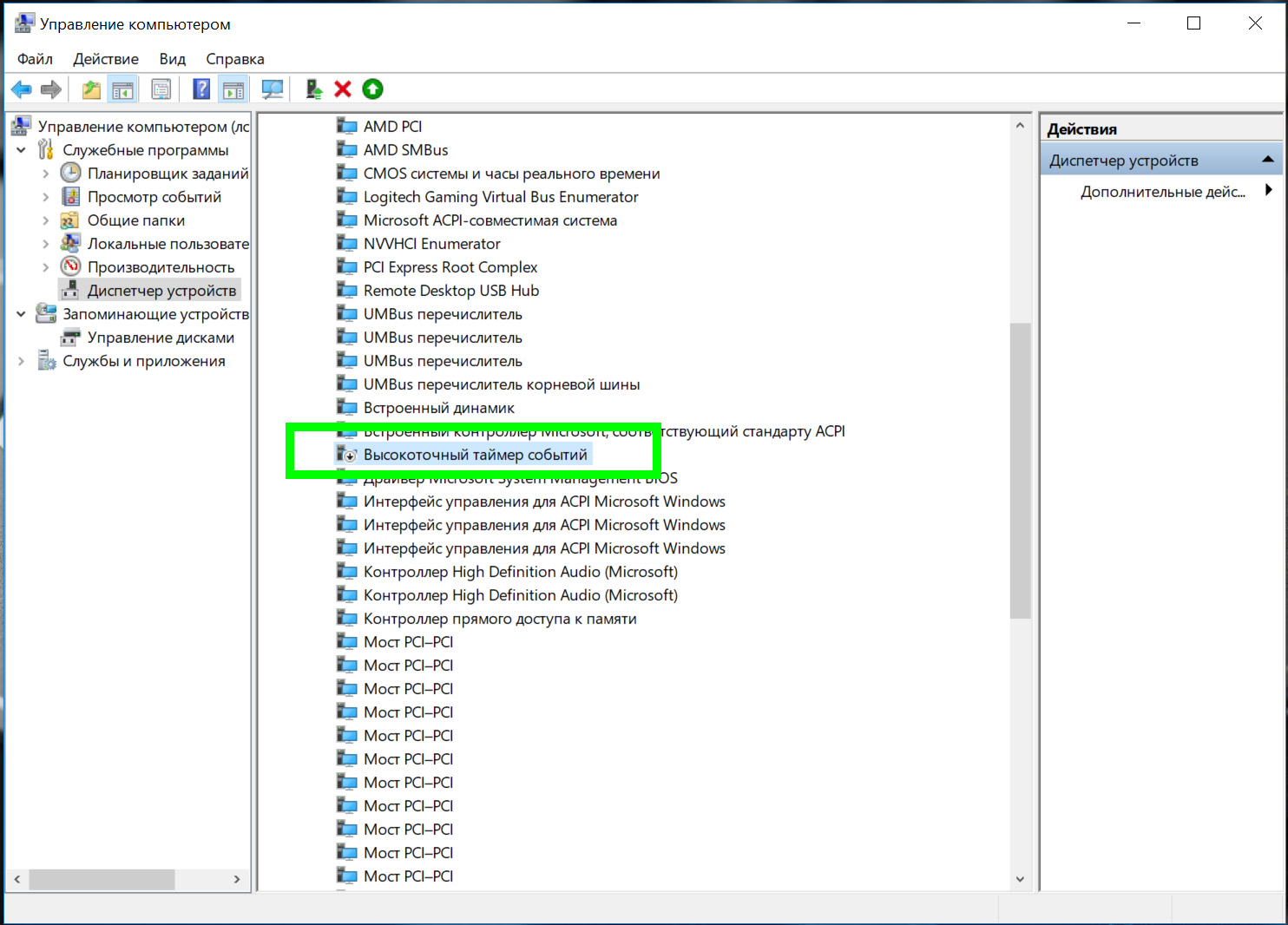 7) В диспетчере устройств отключить "высокоточный таймер".