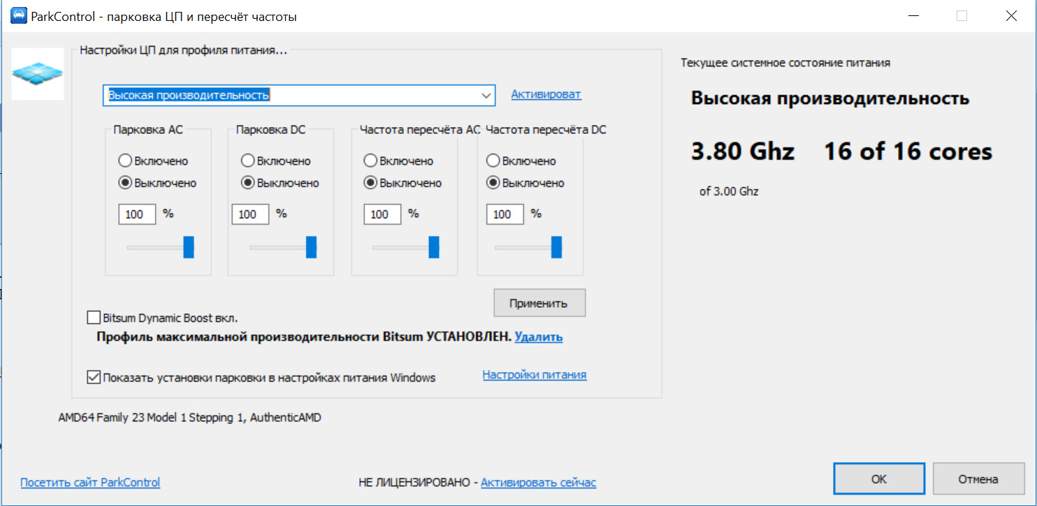 6) Отключение парковки ядер. Качаем ParkControl, все чекпоины ставим на 100% и дисейбл.