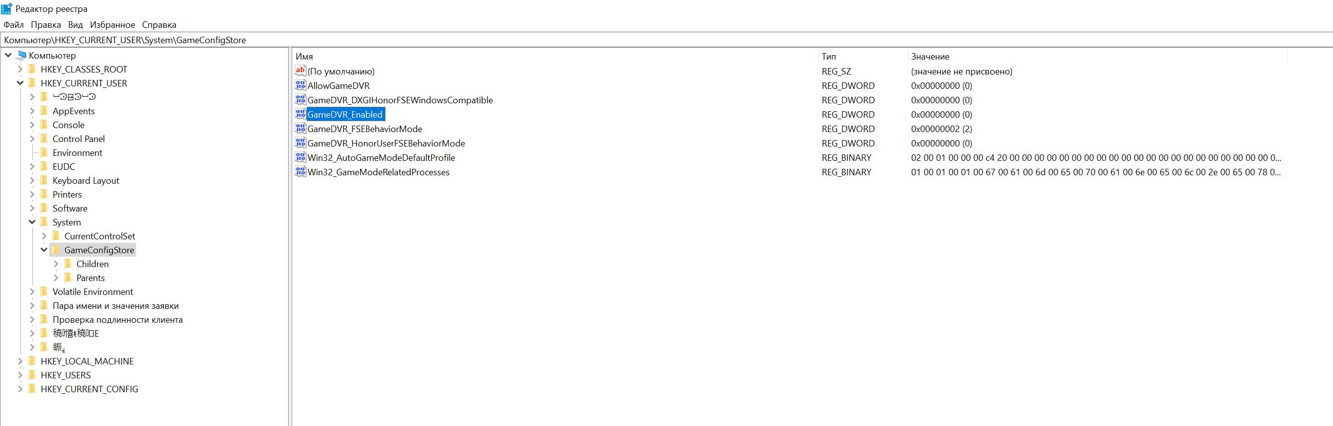 В реестре пройдите по пути: HKEY_CURRENT_USER\System\GameConfigStore. В правой части кликните GameDVR_Enabled. В открывшемся окне вводите значение «0» и нажимаете «ОК».