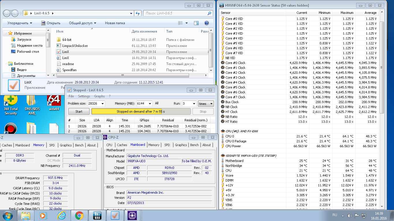 После месяца закрытого доступа (безосновательно) даю новые скрины *** Про низкие температуры, теорию "ОР" (overload protection) и прогоны LinX - В УСЛОВИЯХ, когда ОР - исключён *** Задача - теоретический порог FX в конфиге на Giga970A UD3, память 1600cl11 Итак - пониженная частота - 8350@2511, температуры обеспечены низкие, обдув мой скриновый... То есть - ОР исключён, и если он не будет срабатывать в разгоне, то теоретически должно быть без троттлинга проца и срабатывания "overload protection" на этом конфиге LinX = 61.7гф - что в пересчёте на 4018 (штатная для гиги97) = 98.7гф@5022 = 123.4гф LinX = 61.3гф - что в пересчёте на 4018 (штатная для гиги97) = 98.1гф@5022 = 122.6гф Проверяю на половине ядер @4018= 48гф - в пересчёте на 8 ядер@4018 =96, на частоту @5022 = 120гф То же на 2 ядрах @4922 = 29.31гф в пересчёте на 4018 = 24гф - умножаем на 4 (все ядра) - получаем 96гф пересчитываем на 5022 = 120гф