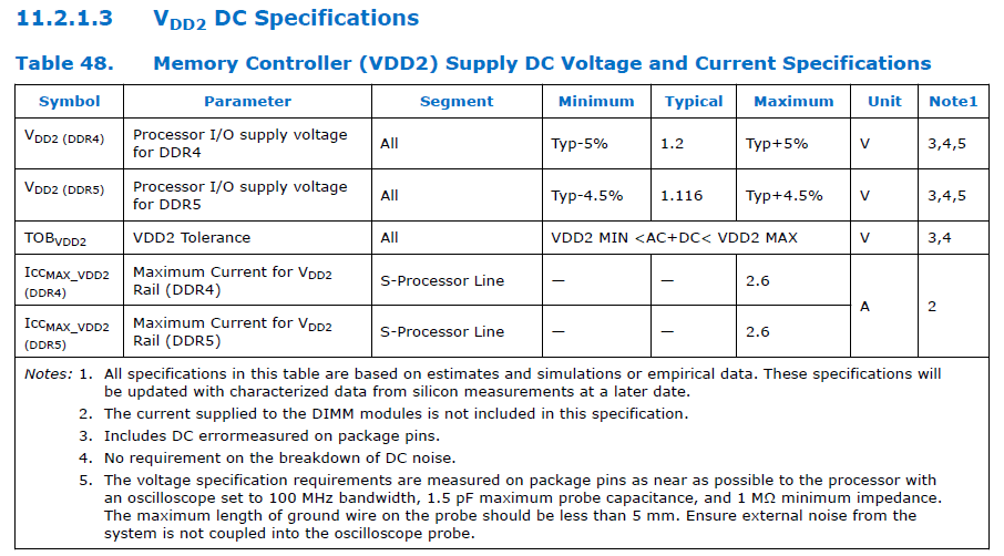 Здесь просто указаны допуски на точность задания номинального напряжения: Для DDR4 - это стандартные 1,2 В ±5 %, для DDR5 - 1,116 ±4,5 %. Причём в эти допуски должно укладываться не только среднее постоянное значение напряжения (DC), но и возможные пульсации (AC). По-моему всё предельно понятно.