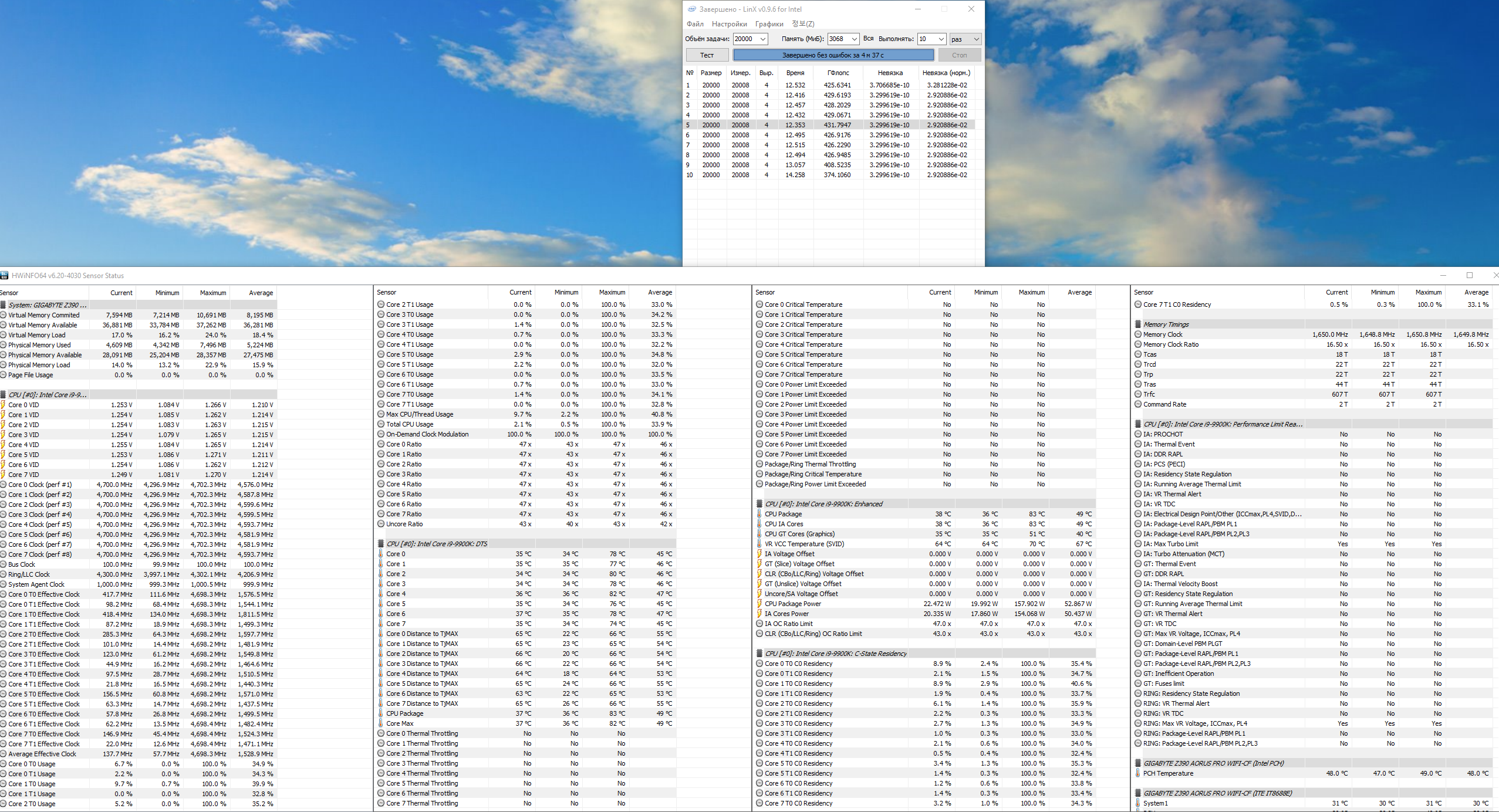 Полученный результат должен иметь следующий вид: Скриншот рабочего стола после прохождения >9 циклов (т.е. между 9 и 10 проходами). Вместе с LinX на рабочем столе должны быть развернуты CPU-Z (первая вкладка) и Core Temp, это обязательный минимум. Такой набор программ даст информацию о напряжении и температурах под нагрузкой-простоем. По желанию можете добавить другие программы, показывающие дополнительную информацию о вашей системе, например третью вкладку CPU-Z, которая покажет модель материнской платы и версию BIOS. Пример результата разгона: Mad Max, 5100 МГц (AVX 0), i7-8086K, HT-ON, Cache 4700, Vcore=1.36V, Batch L805E123, Gigabyte Z370 Aorus Gaming 7 (bios F6), Be Quiet! Dark Rock Pro 4, ЖМ под HS, Windows 10 Pro 64-bit 1809, LinX 0.9.3 64bit.