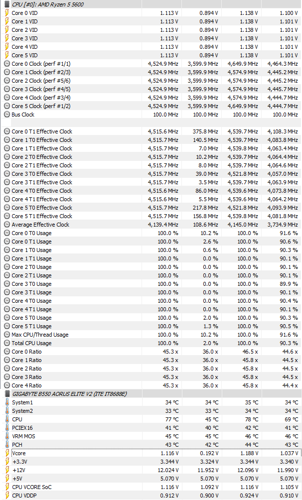 Всем привет! Периодически читаю пару веток на форуме ради интереса и памяти о былом, эту ветку в том числе. Моя система Gigabyte b550 Aorus Elity V2, RX 5600 XT, 32GB 3800cl16. Решил поделиться результатами своего R5 5600. Процессор работает с PBO +200 и curve -25 по всем ядрам, лимиты motherboard. Проверял на стабильность самым тяжёлым тестом OCCT, крутил CB23 + гонял несколько дней BF5, в этой игре загрузка ядер под 90-100% и частоту держит 4650 с температурой до 73 градусов, в других играх температуры меньше, но и эту t' считаю нормальной. За всё время не было никаких проблем, полная стабильность. Пробовал фикс 4.5гц либо 4.6гц при 1.2v начинается печка, температуры улетают в космос. Это к вопросу, что лучше? Фикс или PBO? Для себя я решил, что PBO, т.к. даже в самых тяжелых рабочих приложениях мой процессор держит 4.5гц минимум, но при этом гораздо холоднее фикса, а в малопоточных нагрузках и в играх держит 4.65гц с напряжением не больше 1.2v в пике со средним 1.176v + в простое сбрасывает частоту и меньше греется. До 5600 у меня был 3600 в фиксе 4.3гц на 1.236v и опять же сравнивая фикс и PBO могу сказать, что PBO крутая штука, процессор работает как это задумали инженеры, которые разбираются в этом вопросе лучше всех нас, хотя уверен найдутся люди, которые напишут, что они дураки, а самые прошаренные на этом форуме. Также возможно мне напишут, что я дурак и всё сделал не так, лимиты у меня не те и curve не та и что я вообще не учёл явление миграции чиплетов, а так же диффузной гибритизации Но начав изучать тему OC в далёком 2011 на примере своего Celeron e3300 и в дальнейшем крутя не один FX в поисках идеала, я понял, что идеал это когда всё тихо и стабильно работает и эпоха того самого хардкорного OC осталась в прошлом и пришла эра оптимизации работы железа, чем PBO с curve и является (фикс на низкой частоте и вольтаже тоже оптимизация). ИМХО P.S. процессор работает с памятью на 4000Гц но появляются ошибки в HWINFO bus/interconnect error, оставил память 3800Гц.