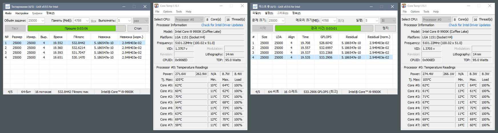 йохууу! Прошел линкс на 51/48 AVX 0! 25000 на 10 проходов. LLC6 Adaptive 1,35 Offset -0.05 1,3 в простое и 1,225 в просадке Хочу чтобы добавили в статистику разгона пользователей 5100 МГц (AVX 0), i9-9900K, HT-ON, Cache 4800, Vcore=1.3V, Asus Apex XI (bios 1401), Noctua D15, Припой, Windows 10 Home 64-bit 1909, LinX 0.9.6 64bit.