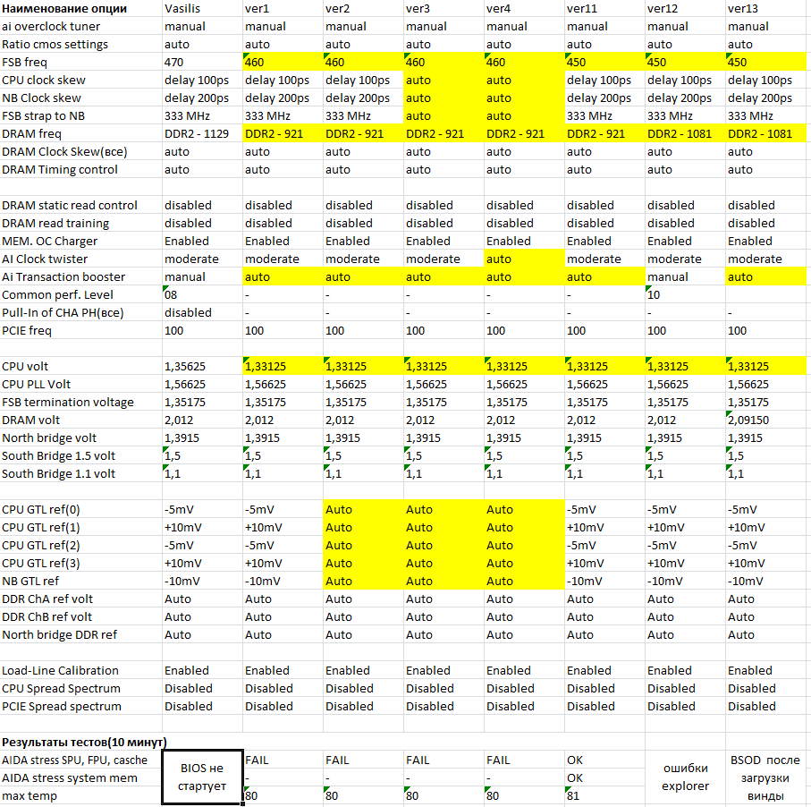 ver1 - HW fail без mem test Включил Ai transaction booster и установил Common perfomance level = 08 и BIOS даже не показался ver2 HW fail без mem test(t max = 80 град) ver3 HW fail без mem test(t max = 80 град) ver4 HW fail без mem test(t max = 80 град)