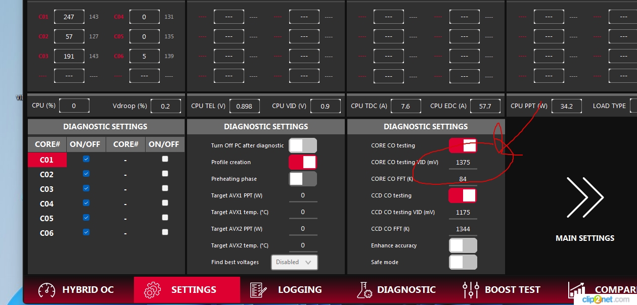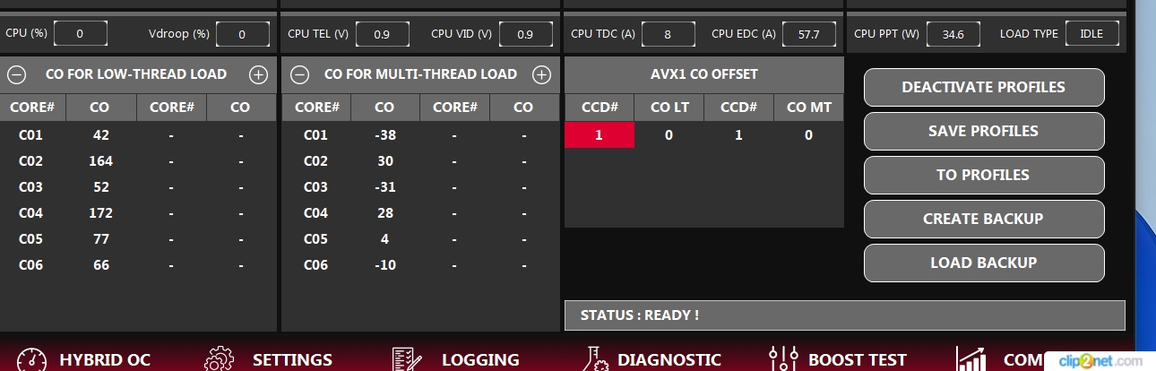 Моё CO: -30, -21, -21, -27, -27, -27, -27, -30 (первое и последнее ядро - худшие). Андервольтится он, конечно, дико. Ограничил EDC на 90, т.к. агеса новая, без этого проц не жарит. PPT и TDC - 200 и 160, кажется.
