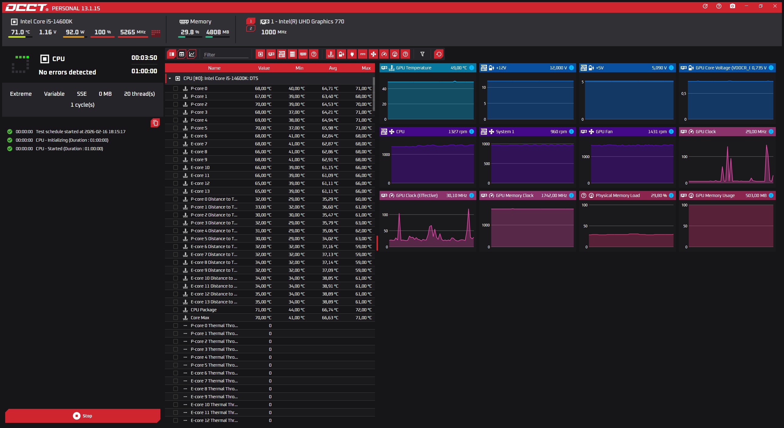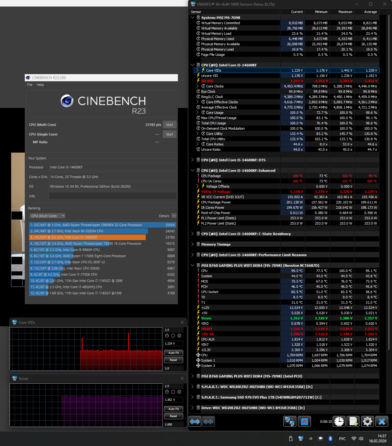 Кольцо и Е-Ядра тоже хотят напряжение. Этого не видно у тех кто крутит топ под водой на 1.3v+, там почти всегда упор в P-Ядра. А всякие 1.2v или даже меньше будут упираться и в кольцо и E-Ядра, даже если они в стоке. Особенно если пытаться уйти ближе к 1.1v Если душить чисто P-Ядра, то сначала скидываем до 40 кольцо и E-Ядра. Можно даже до 36, если хотим ближе к 1.05v. Потом "разгоняете" их обратно и корректируете всё вместе. Лимит тока для 14600k воткните 250А, а иначе вы нифига не протестируете нормально в грелках. Да и остальные лимиты тоже. Или хотя бы тестируете гибридной нагрузкой, отключая часть потоков и чередуя.