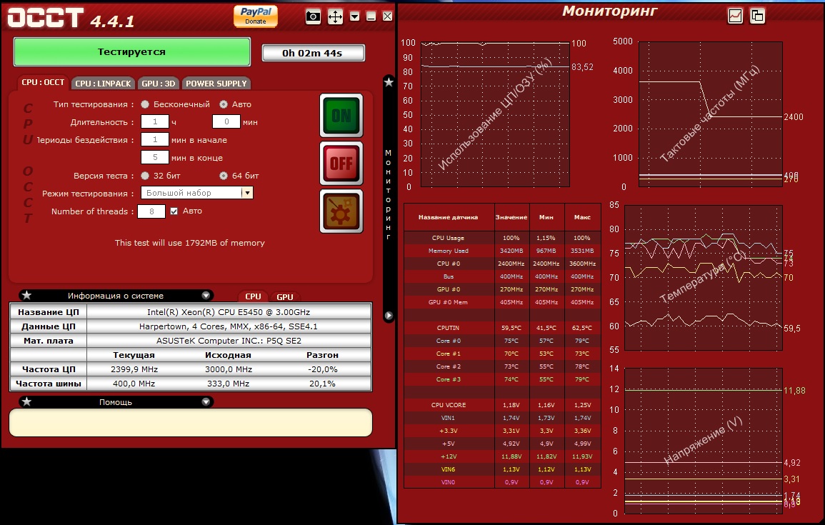 Всем привет! Проконсультируйте что я сделал не так? Системная плата: Asus P5Q SE2, проц: Xeon E5450. На второй - третьей минуте падает частота процессора ниже изначальной. Напряжение поднимал до 1,35, но ничего не изменилось.