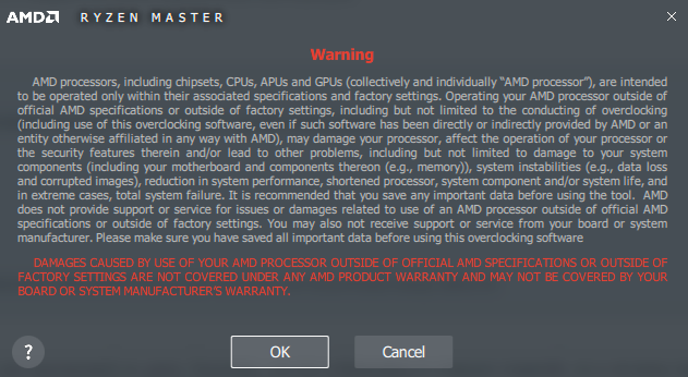 Белым по серому написано или красным по серому, что использование данного софта может принести вред ПК, поэтому сохраните свои данные и прочее, а также АМД в этом случае снимает с себя все обязательства, т.к. пользователь использовал процессор за рамками заводских настроек.