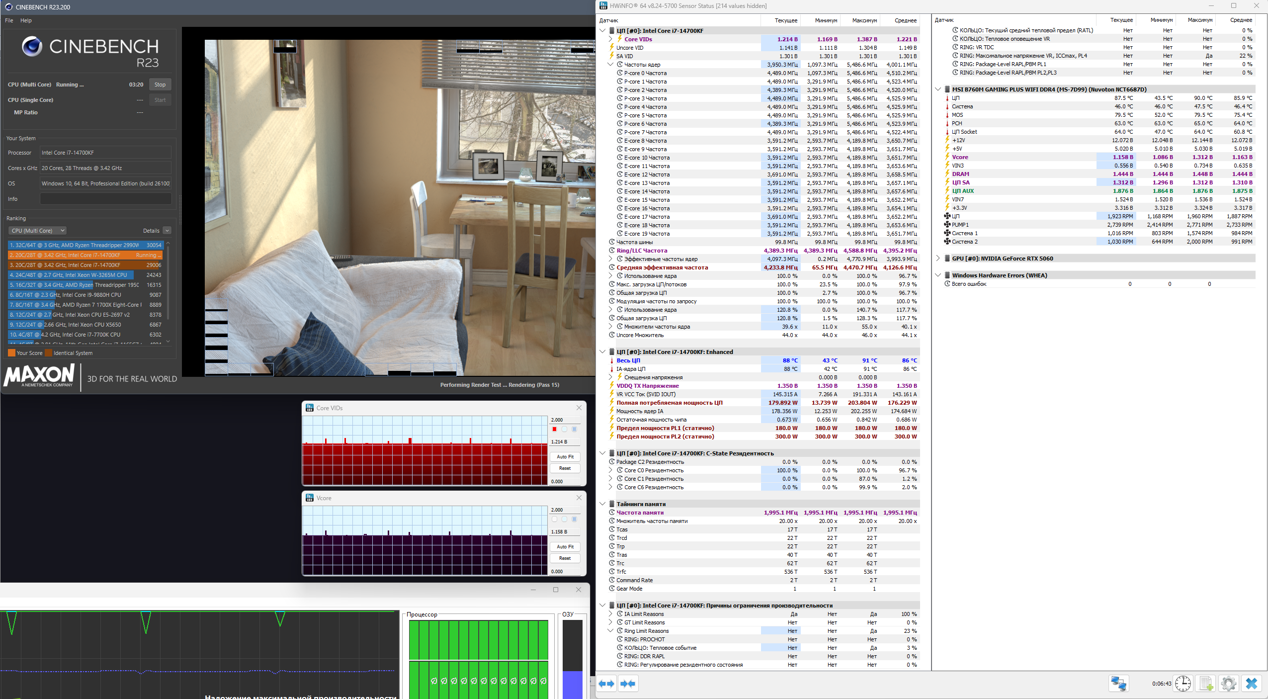 Было 29006, стало 29724. При этом видно, насколько vcore ниже чем VID (дельта составляла от -0,05 до -0,08В). Мне кажется, только на Z790 и СЖО 360 можно достичь заветных 33...36к "попугаев" (10-17% не добираю).... Или я что-то принципиально не так делаю?