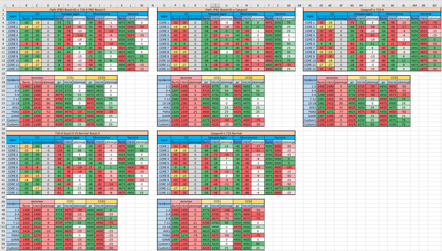Данный способ выравнивания VID дает лучшую производительность в многопотоке, все ядра "причёсываются" под VID лучшего ядра (которому нужно больше напряжения). Но при этом способе падает однопоточная или малопоточная производительность, поэтому такой способ отчасти хорош, "костыли" это. Пока что из всех разных способов наилучшую производительность под разные задачи показывает Hydra, она обходит даже наиточнейшие многонедельные поядерные тесты CoreCycler потому что в поядерном тесте не учитывается то, что ядра 4-5-6- и тд по рейтингу CPPC никогда не будут максимально буститься. Но с гидрой пришлось повозиться сначала много тестами чтобы понять логику автора, потому что реально рабочего мануала объясняющего все процессы нет в инете. Уже после понимания этого стало ясно какой это гибкий и мощный инструмент, а главное почти полностью автоматизированный на своих этапах. P.S. Пример расчетов чтобы понимать сколько было потрачено времени на тесты (порой чтобы заполнить одну таблицу требовалось до 50 часов работы теста поиска.