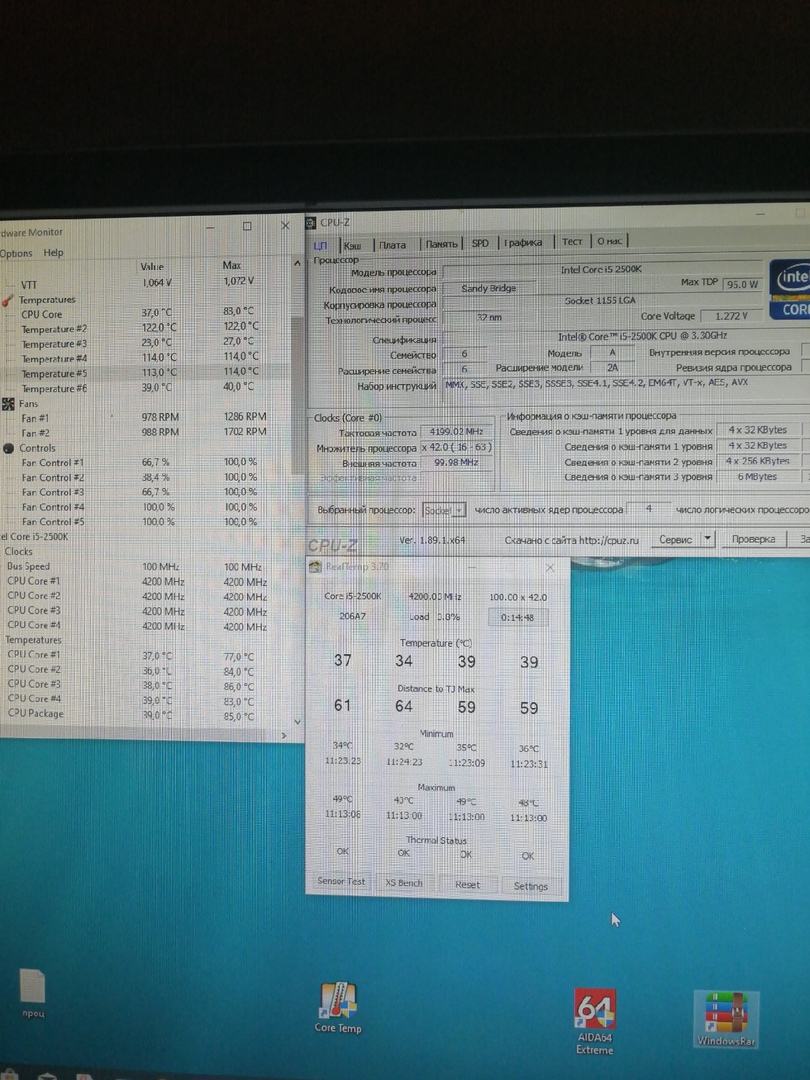 Подскажите пожалуйста может кто знает в какую сторону копать. Установил 9700к на сокет 1151 v1, на фото будет. Так вот проходит тесты типа тестмем5, синебенч, корону рендеринг, но вот линкс и прайм 95 не проходит ни в каую. Линкс зависает на 26-30 секунде так и не начав давать нагрузку. А прайм через секунд 5-10 синий эран. Есть подозрения на винду, она сильно захламлена, попробовал стрельцом линкс все равно не прошел. Вольтаж камня 1,36, оперативы 1,38. s i/o 1,21 В играх вроде все хорошо, но спустя часов 5 бывает вылет. Есть подозрения куда копать?
