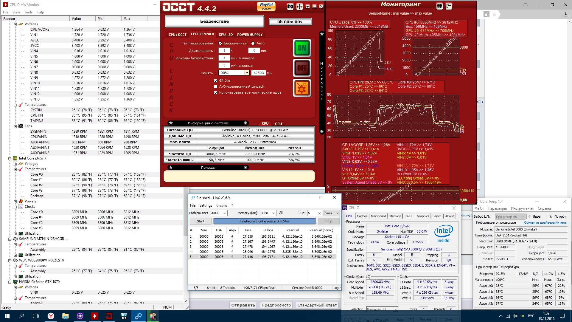 напруга рабочая. Помимо Линкса я еще ОССТ гонял (тест CPU:OCCT), прогоны Линкса тоже не разово были, а с интервалами (комп гонял Линкс, я гонял чай), также пробег бенчмарка Сталкер: Зов Припяти на минимальных настройках графики, ну и Сайнбенч несколько раз комплекс однопоток+многопоток.