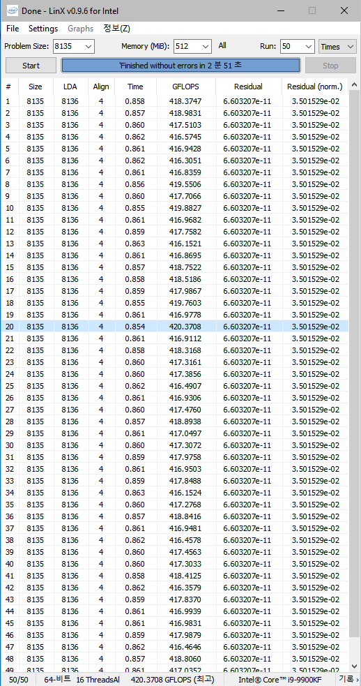 Фух, разобрался с этими невязками, в частности на маленьких задачах. Что с LinX, что с "правильным" консольным линпаком такое. Думал, что реально переразгон и недокрутил напряжения. Похоже, они от малейшего чиха, дёрганья мышки и любой фигни в фоне могут не совпасть. Даже если вся система в даунклоке с превентивно задранными вольтажами. Всё позакрывал, даже хвинфо и диспетчер задач, мышку на всякий случай перевернул - вуаля.