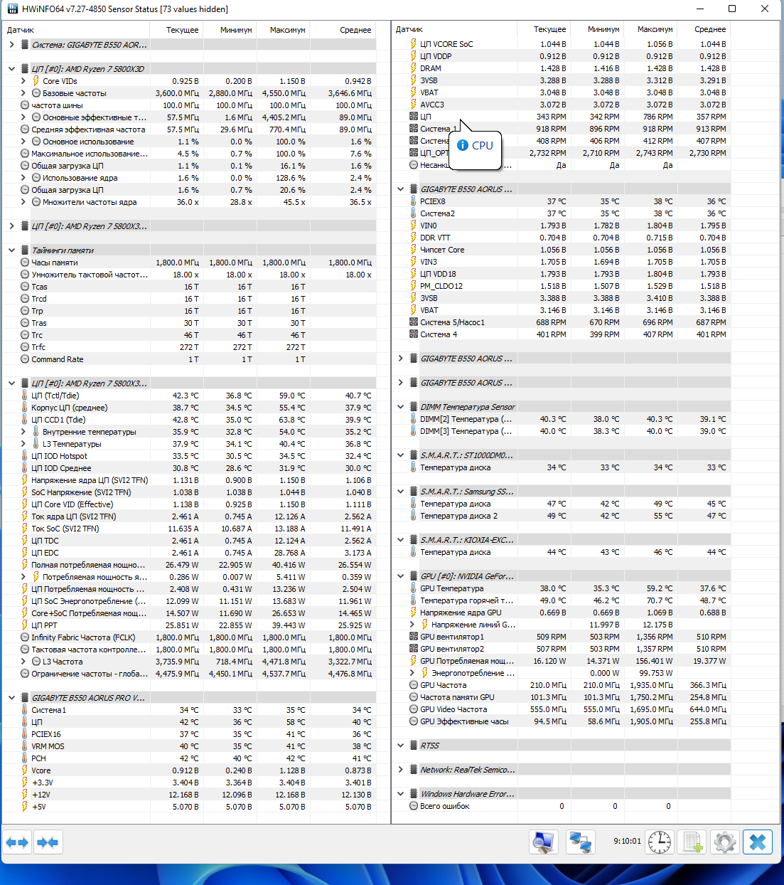 9 часов обычного использования 5800x3d в режиме PBO, максимальная напруга за это время 1.13v, нет того дурного бесполезного буста в режиме рабочего стола как у 5800х с напругами под 1.3-1.4, самое тяжёлое что запускал за девять часов это проверку windows defender, в простое обычно около 40 градусов