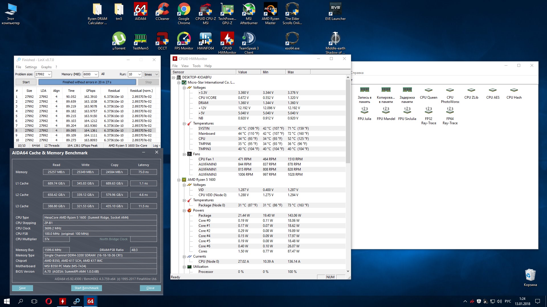 - Обычно поставляется в коробке с системой охлаждения Wraith Spire RGB (это круглая конструкция из целого куска алюминия с медной вставкой-испарительной камерой в основании и вентилятором с кольцом разноцветной подсветки, крепится к задней пластине разъёма AM4 четырьмя винтами). - Штатно имеет базовую частоту 3.0ГГц, частоту 3.2ГГц (технология Turbo Boost) при обычной многопоточной нагрузке (Blender n-cores render) и 3.75ГГц (технологии Precision Boost и XFR) при однопоточной нагрузке (Cinebench R15 single core). - Штатное напряжение питания 1.1875В. Может возрастать до 1.3В на отдельных ядрах во время работы Precision Boost и XFR. - Очень энергоэффективный, требования к СО (TDP) - всего 65W. Энергопотребление порядка 10Вт в простое и 85Вт в обычной многопоточной нагрузке (Blender n-cores render).