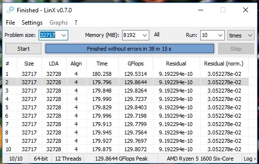 Вопрос не праздный, а, можно сказать, насущный. Дело в том, что и я сейчас решил сделать один прогончик на 8 ГБ. Просто хотел посмотреть, получится ли при этом меньше флопсов, так как Denis_PПроцессоры AMD Ryzen (Микроархитектура Zen) #15296310 огорчался, что у него их почему-то меньше, чем у AmfuПроцессоры AMD Ryzen (Микроархитектура Zen) #15295308 Вот я и подумал, что, возможно, это из-за того, что у первого LinX гоняется на 8 ГБ, а у второго - на 6 ГБ.