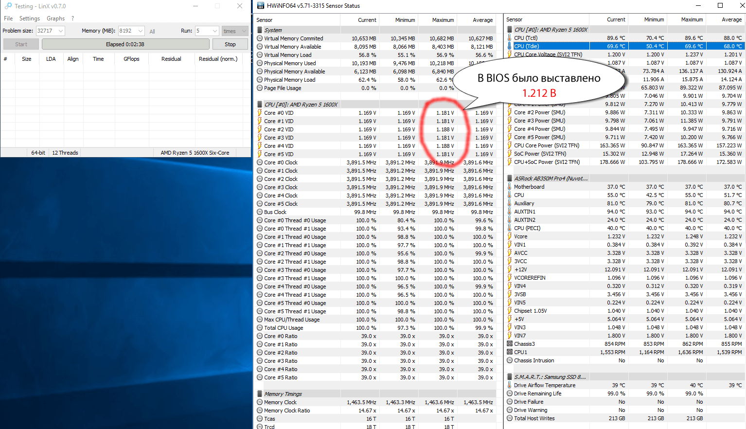 Далее, при прогоне на 8 ГБ, при помощи hwinfo заметил несколько, как мне кажется, аномальную вещь. Ну, по крайней мере для меня, нубо-гонщика) Во время прохода сенсоры всех ядер Core # VID выдавали, что напряжение заметно не дотягивает до того, которое было выставлено вручную в BIOS. На это сразу бросился взгляд, так как ранее в LinX у меня никогда не наблюдалось такой картины. То есть до этого, в тех, пускай и не столь многочисленных тестах, максимальное Core # VID всегда равнялось тому, что было установлено в BIOS.