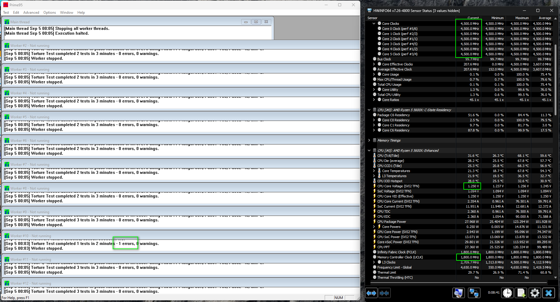 у меня проц тоже требует на ~50-75мв выше вольтаж, если память 3800 выставить. Попробуй запустить память на 3600, тогда для 4500 мб хватит даже 1.2-1.225в. Я только из-за этого поменял настройки и отказался от 3800)