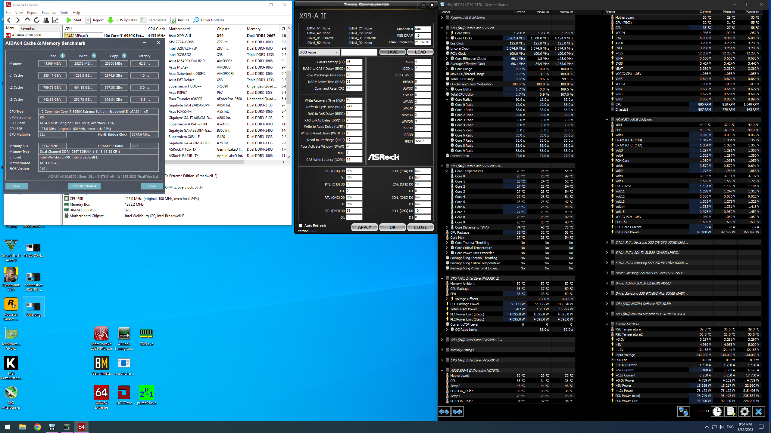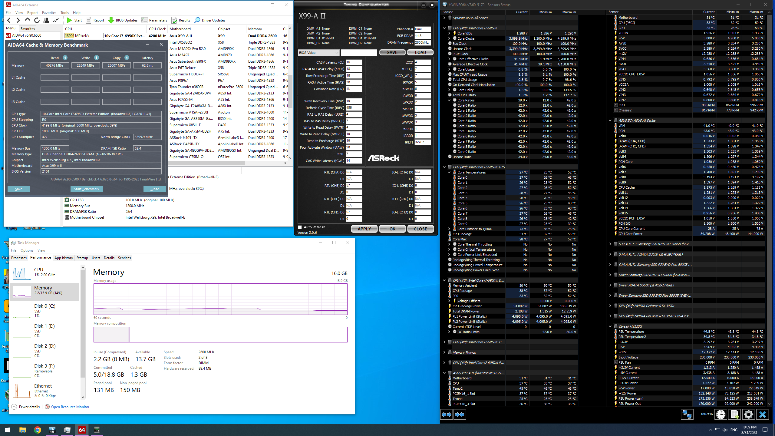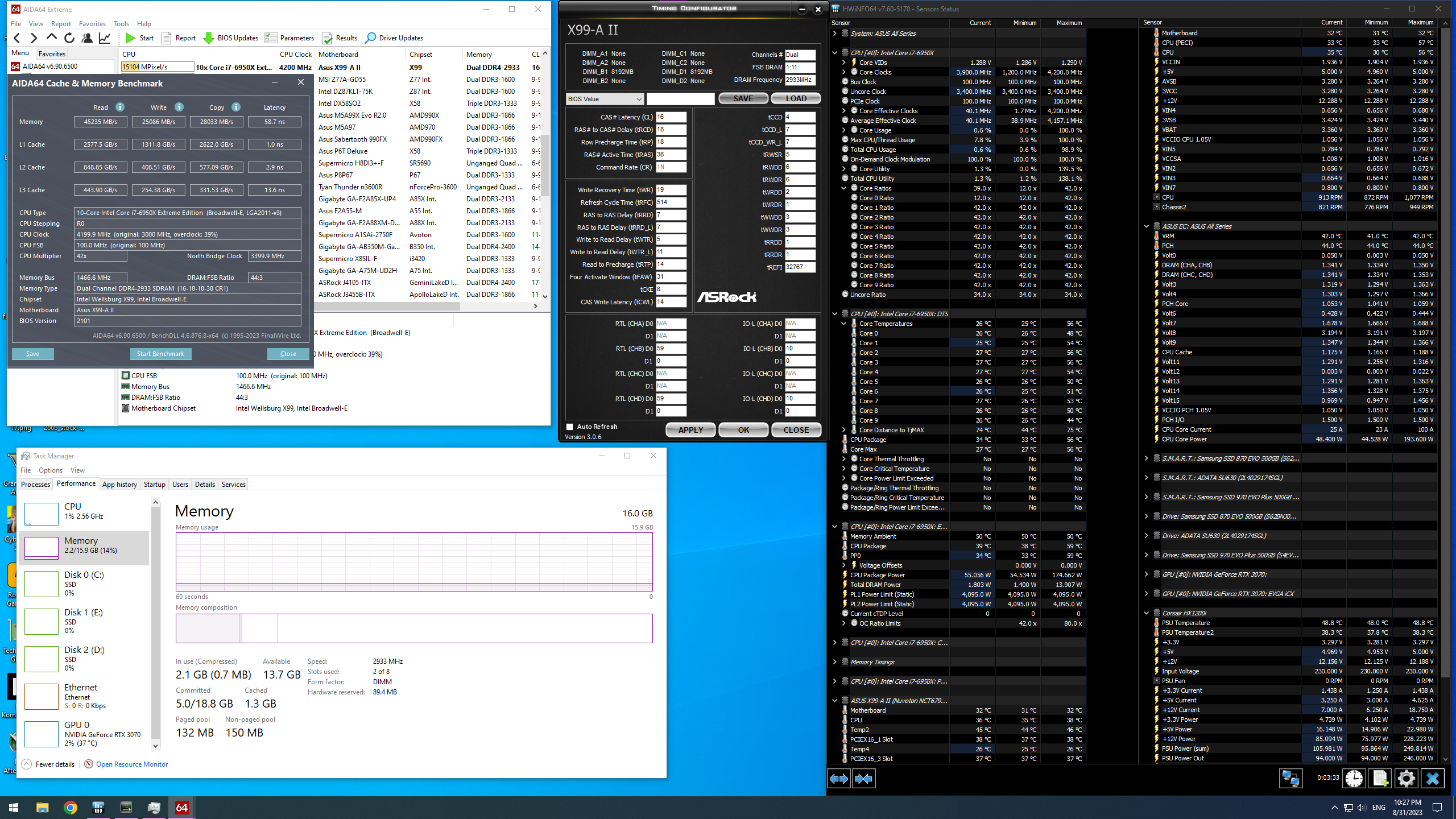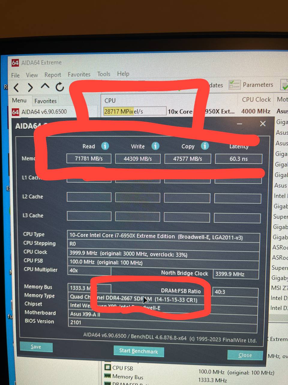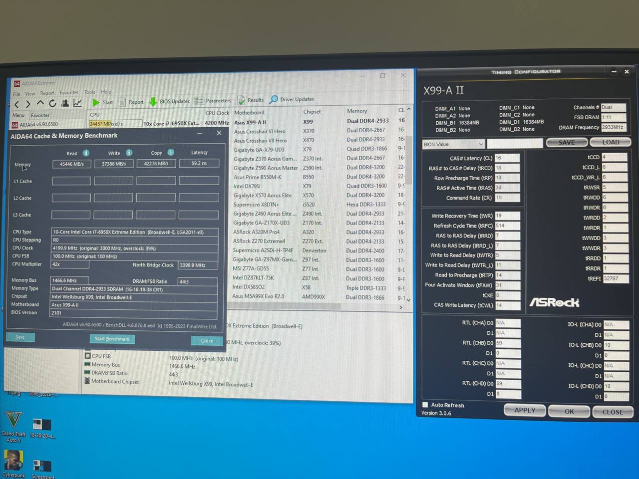 Приветствую. Перекурив страниц 150 топика за ночь, так и не обнаружил ни одного логического вывода почему после "кукурузного разгона памяти" на моём 6950X получается бешенный разрыв между Чтением и Записью+Копированием. XMP моих стиков 3200 16-18-36 1.35V (Micron E-die, 8GB на палку => итого 32GB в сумме). И я уверен в этих стиках, так как ради тестов использовал их с 10900k и там они брали свои заявленные частоты без такого видимого перекоса по записи и копированию. После потраченной кучи нервов и возни с биосом платы, было решено достать все 4 стика Ballistics и пробовать по одной или парой. Был очередной раз неприятно удивлён тем, что не смотря на установку в одно- или двухканале и установке частот да хотя бы на 2933 или 2633 просадка есть и она видна прям ну очень. Ради эксперимента поставил вместо Micron E-die два стика Samsung B-die по 16GB каждый (увы, какие были). Каково было моё удивление, когда "кукурузный разгон" на тех же 2933 c зафиксированными 16-18-38 CR1 на B-die-ях оказался вовсе не кукурузой и перекос ушёл. После того как обсудил с несколькими оверклокерами из своего круга общения, пришёл к выводу что проблема в совместимости моей X99 A-II и стиков памяти. Видимо или какие-то скрытые тайминги встают криво или ещё чего. Если честно, не знаю чего и думать - так что буду рад сообщениям на тему "чего крутить и что делать?".