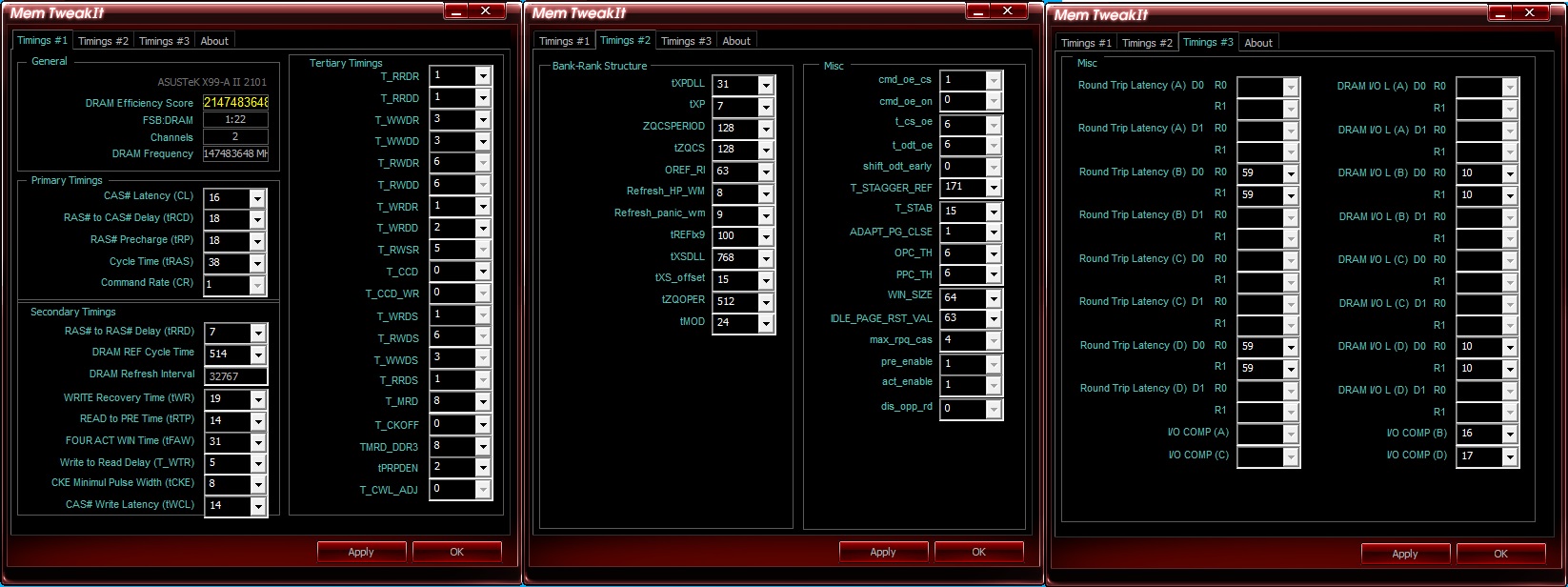 1) 100:133 использую и так всегда при разгоне, здесь тоже поставил и забыл 2) при всём уважении (помню вас по топику китайского х99, огромное спасибо за инфу там) я не понимаю зачем мне трогать 125 страп; я ведь предметно показал что при смене стиков пропадает просадка. Все настройки в биосе крутил (и это не пустые слова), ни одна не решает проблему. Это не DRAM current limit, ни ещё что-то. Ну и да, ещё раз - все основные настройки, такие как вольтажи, частоты, шины и прочее зафиксированы. Были тесты где и тайминги тоже зафиксированы, но это не решает проблему.